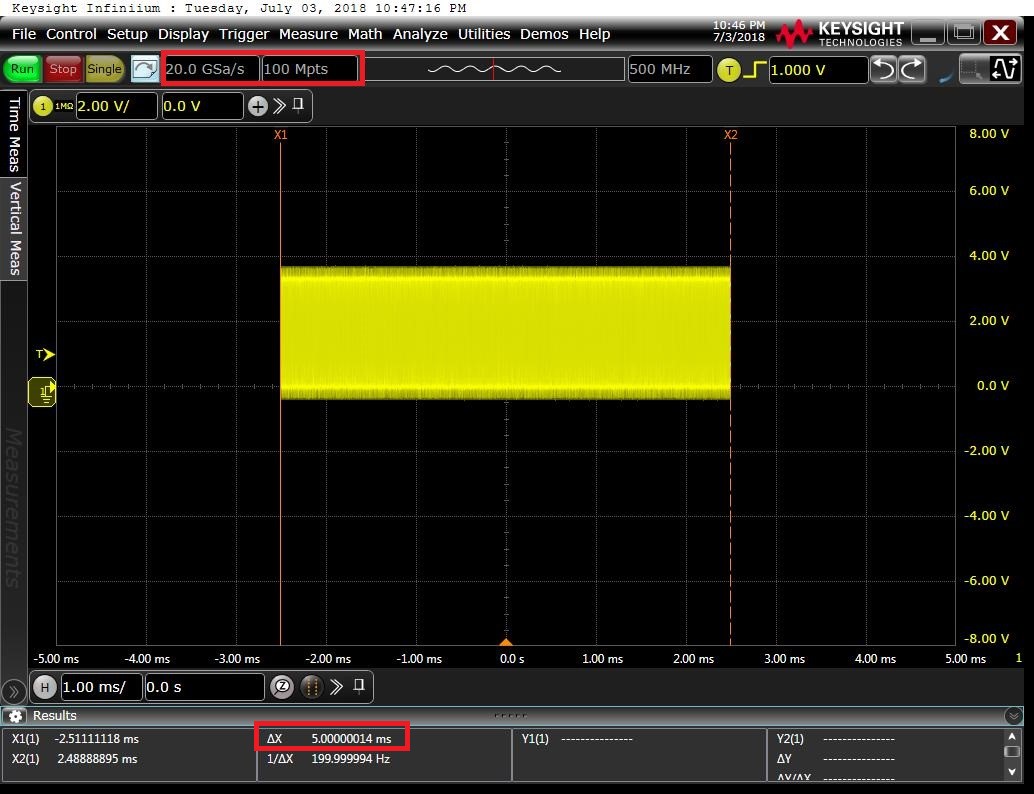 对于高速的数字实时示波器来说,由于其采样率很高,这个高速的数据以现有的数字处理技术是不可能实时处理的。所以数字示波器在工作时都是先把信号采集一段到其高速缓存中,然后再把缓存中的数据读出来显示。这段缓存的深度,有时也称为示波器的内存深度(存储深度),决定了示波器在进行一次连续采集时所能采集到的最长的时间长度。通常用以下公式计算示波器能够一次连续采集的波形长度:时间长度=内存深度/采样率。如下图六所示,内存深度是100Mpts,采样率为20GSa/s,所以时间长度为5ms。