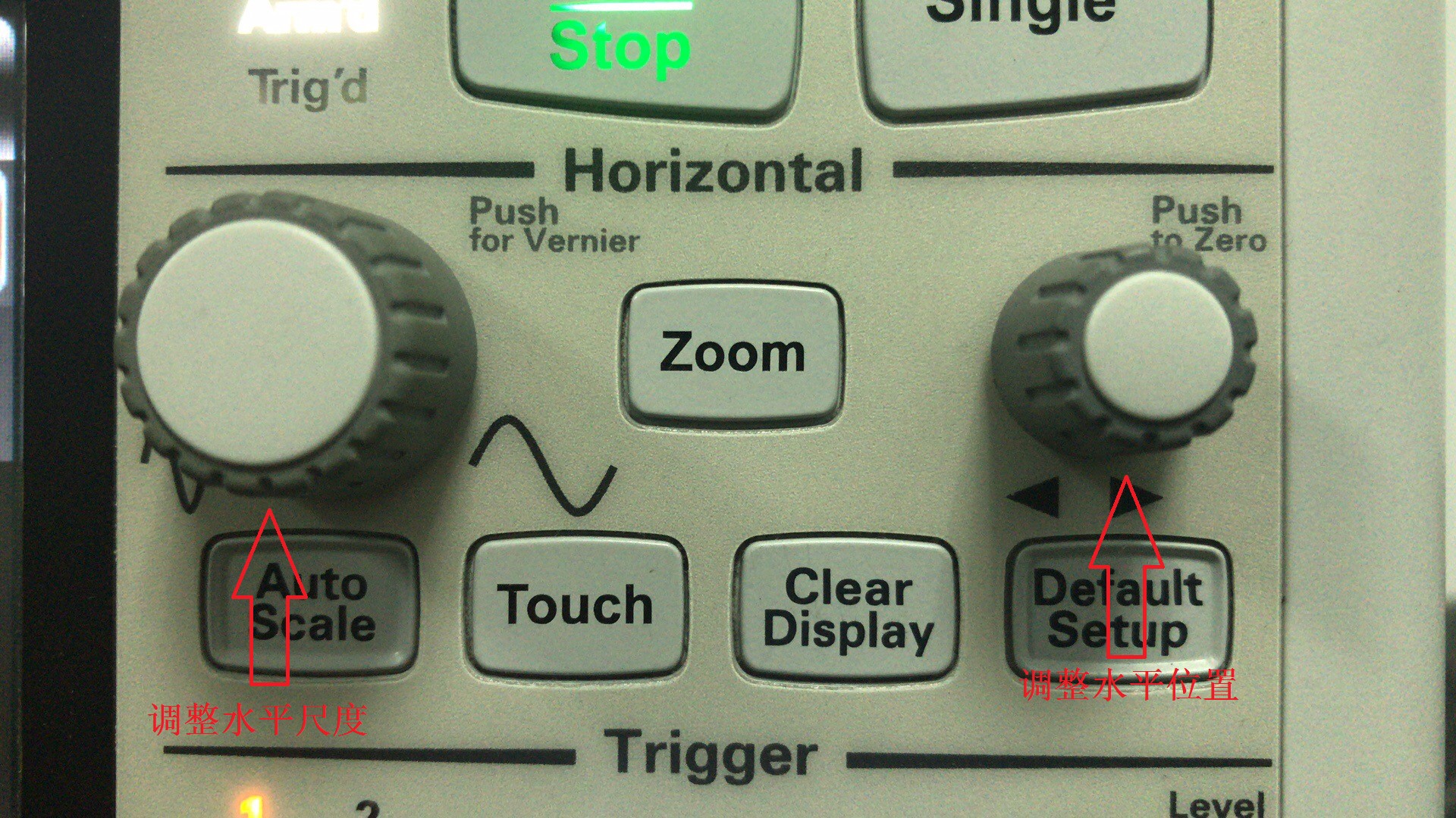需要注意的是,一般我们所说的示波器的内存深度是这台示波器配置的最大内存深度。由于内存深度设置很深时示波器要处理的数据量很多,可能波形的更新速度会很慢。有的示波器厂商为改善用户使用的感受,默认会根据示波器时基刻度来自动调整所用的内存深度,而当内存深度增加到最大仍不足以保证采集更长的时间时,示波器通常会自动降低采样率以获得更长的采样时间。因此在增加示波器的时基刻度时,非常重要的一点是要注意观察示波器采样率的变化,防止采样率的下降造成信号的失真或混叠。图七是示波器的水平调节按钮。