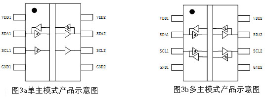 在多主模式下,如果使用传统光耦进行隔离,由于串行数据线SDA和串行时钟线SCL都需要双向通信,因此需要4个光耦。如上同样的原理,可选择2片π121M41(SOP8封装)或者1片π142M41(SOP16封装),以更低的成本,更小的PCB板上空间实现可靠接口隔离。荣湃半导体针对I2C接口隔离,2018年10月推出的π2系列的产品,如图3a所示(单主模式产品),图3b所示(多主模式产品),可实现1片SOP8封装IC及更少的外围器件实现可靠I2C接口隔离。