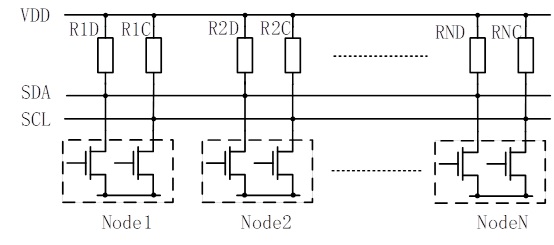 如图1所示,I2C总线由串行时钟线(SCL)与串行数据线(SDA)连接至通讯节点上,并通过上拉电阻RD与RC接至供电电源VDD。需要上拉电阻的原因在于,I2C总线采用开漏输出技术。即逻辑0时,开关管导通,把总线拉低至地;逻辑1时,开关管关闭,需要外接上拉电阻,使总线接至VDD.
