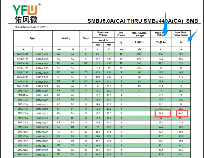 以SMBJ15A为例,下图中提到了的两个参数:最大钳位电压和脉冲峰值电流,其承受的最大浪涌功率为:最大钳位电压*脉冲峰值电流=24.4V*24.6A=600.24W。