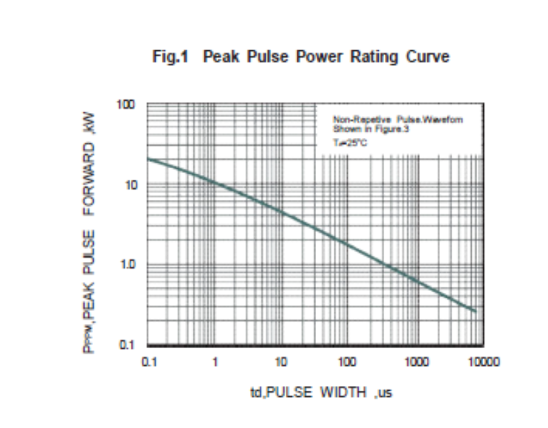 实际产品中,最常用的浪涌测试波形为1.2/50us和10/700us,如何将TVS承受浪涌功率从10/1000us波形下换算到其他波形呢,这就需要看Spec中的另一个曲线图: