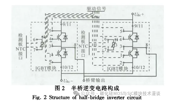 图中,U 为直流侧电压;C₁ 为母线电容;L,C 为滤波电感、电容;lab为逆变器三相输出电流;iace为三相滤波电感电流;eace为三相电网电压。控制系统由DSP芯片TMS320F28335和CPLD芯片EPM240T100C5 构成,CPLD 除辅助DSP芯片对输入输出的数字信号进行逻辑控制外,还虚拟成外设 RAM 扩大控制系统的存储空间。为实现大功率 输出,逆变桥采用半桥模块FF1400R12IP4,如 图 2 所示,两个FF1400R12IP4并联组成一个半桥桥 臂,由2QD30A17K-I 驱动核构成驱动模块,对同 一桥臂的两个IGBT半桥模块采用同一信号进行 驱动,通过NTC 检测对IGBT 模块工作温度进行 监控。同一半桥的两个模块安装在同一块散热器 上,保证模块温度接近,能够根据模块正温度系数 实现模块间自动均流。