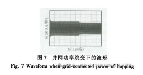 图 7 为 PCS 并网功率跳变下的实验波形。由 图7可得,并网电流能实现平稳跳变,验证所提 控制策略具有良好的动态性能。