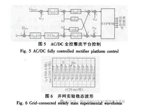 如图5所示,AC/DC 全控整流平台通过对Ud的稳压控制实现对电池的模拟,并对PCS输出的无功功率进行补偿以降低配电需求,uc为电容C₂的端电压,Udae 为直流给定参考电压,ed为整流平台并网电压的d,q轴分量,e₁₅=0,Ea 为电压幅值,w 为电网角频率,Q 为公共并网点的并网无功功率,i为整流平台输出电流的d,q轴分量,GR(s),Gp₂(s),Gp₃(s)为PI 调节器。图6为有功功率给定 值为-295kW、无功功率给定值为-320 kvar 时PCS的并网实验波形,图6可验证所提控制策略具有 良好的稳态性能。
