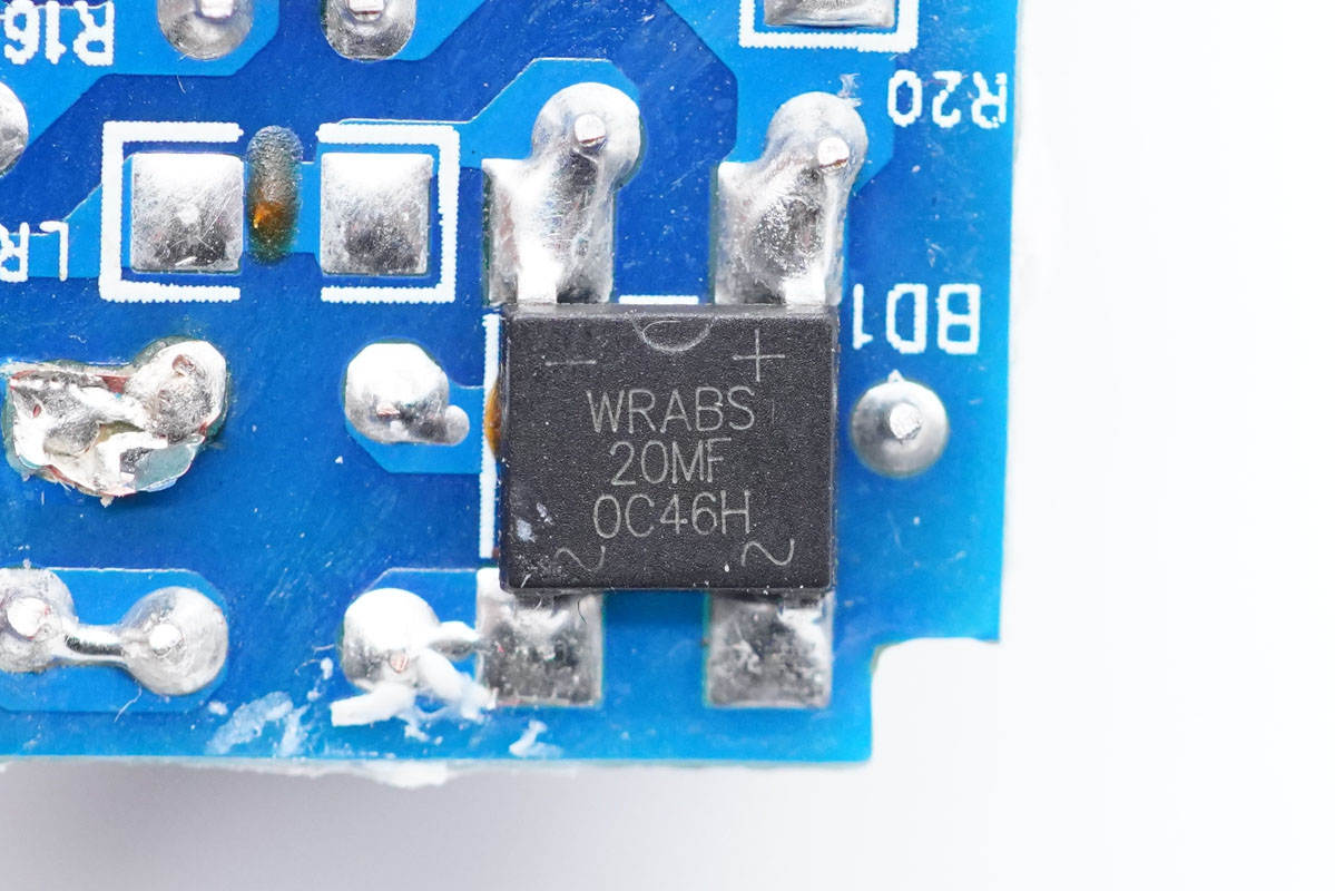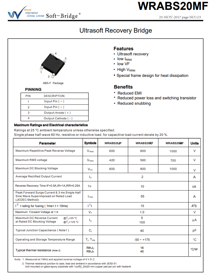 整流桥采用深圳市沃尔德实业有限公司的WRABS20MF。反向峰值耐压1000V,平均整流电流2A,正向峰值可承受电流55A,正向压降1V,工作温度-55到175℃。这颗软桥通过较软的恢复曲线,比较平滑的关断特性,可以降低二极管结电容达到非常少的谐波振荡产生的效果。