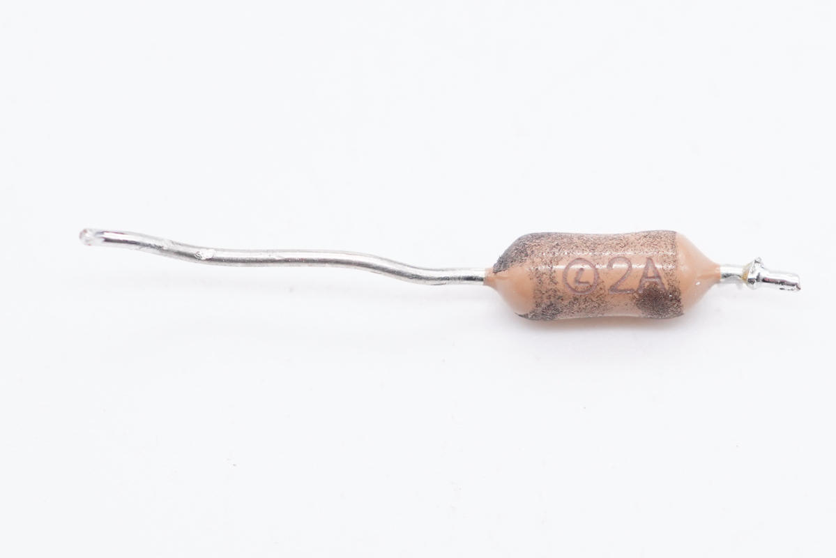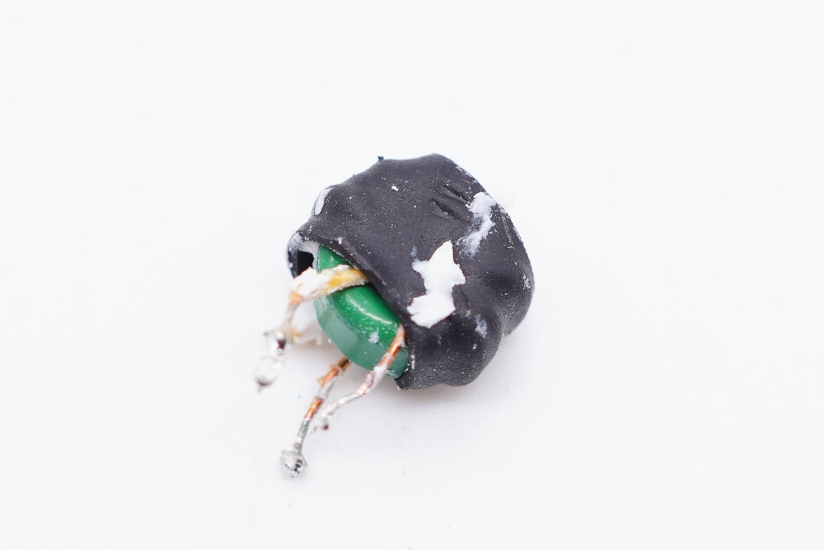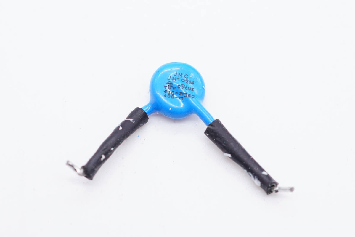 蓝色Y电容特写,焊脚套有绝缘管。
