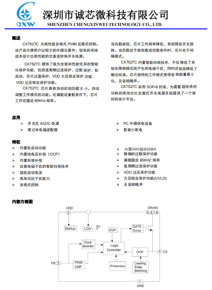 CX7527C采用了抖频技术,能够有效改善系统的EMI性能。系统的跳频频率设置在音频(22KHz)以上,在工作时可以避免系统产生噪音。内置多种保护,包括逐周期限流保护(OCP),过压保护(VDD OVP),VDD过压箝位,欠压保护(UVLO), 过温保护(OTP)等,通过内部的软驱动结构可以更好的改善系统的EMI特性。