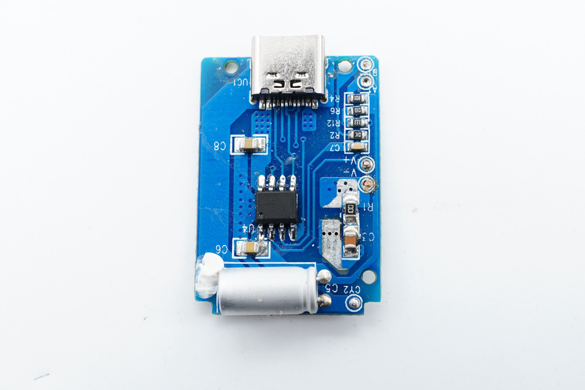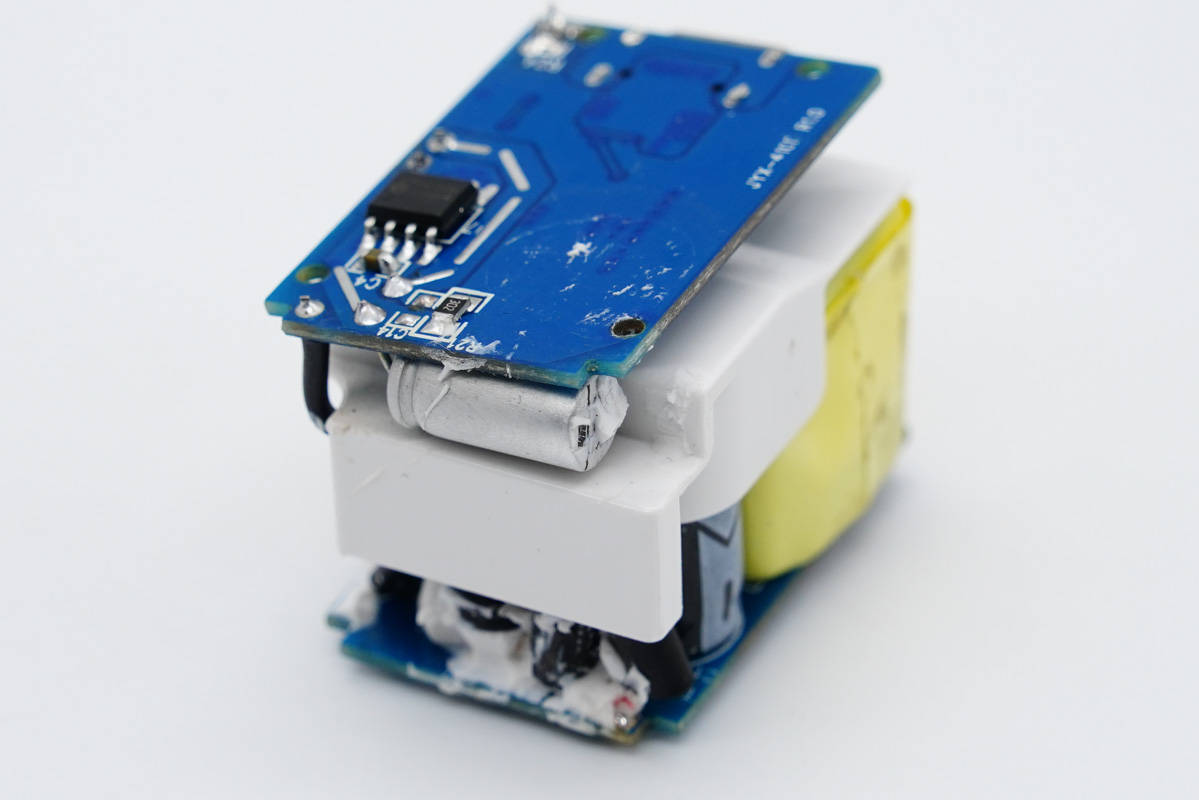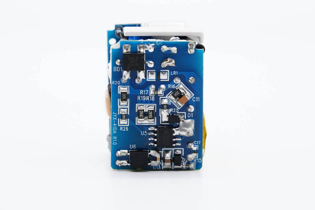 充电器采用上下层小板设计,之间有白色塑料壳进行绝缘隔离。