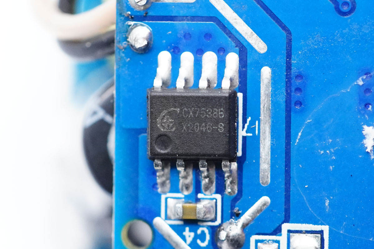 次级同步整流芯片同样来自诚芯微,型号CX7538B。这是一颗高性能的开关电源次级侧同步整流器芯片,在开关电源中轻松满足6级能效,是肖特基的理想替换方案。CX7538B支持最高150KHz开关频率,内置11mΩ低导阻NMOS管,发热远低于肖特基二极管,大幅度降低温度,提高转换效率。