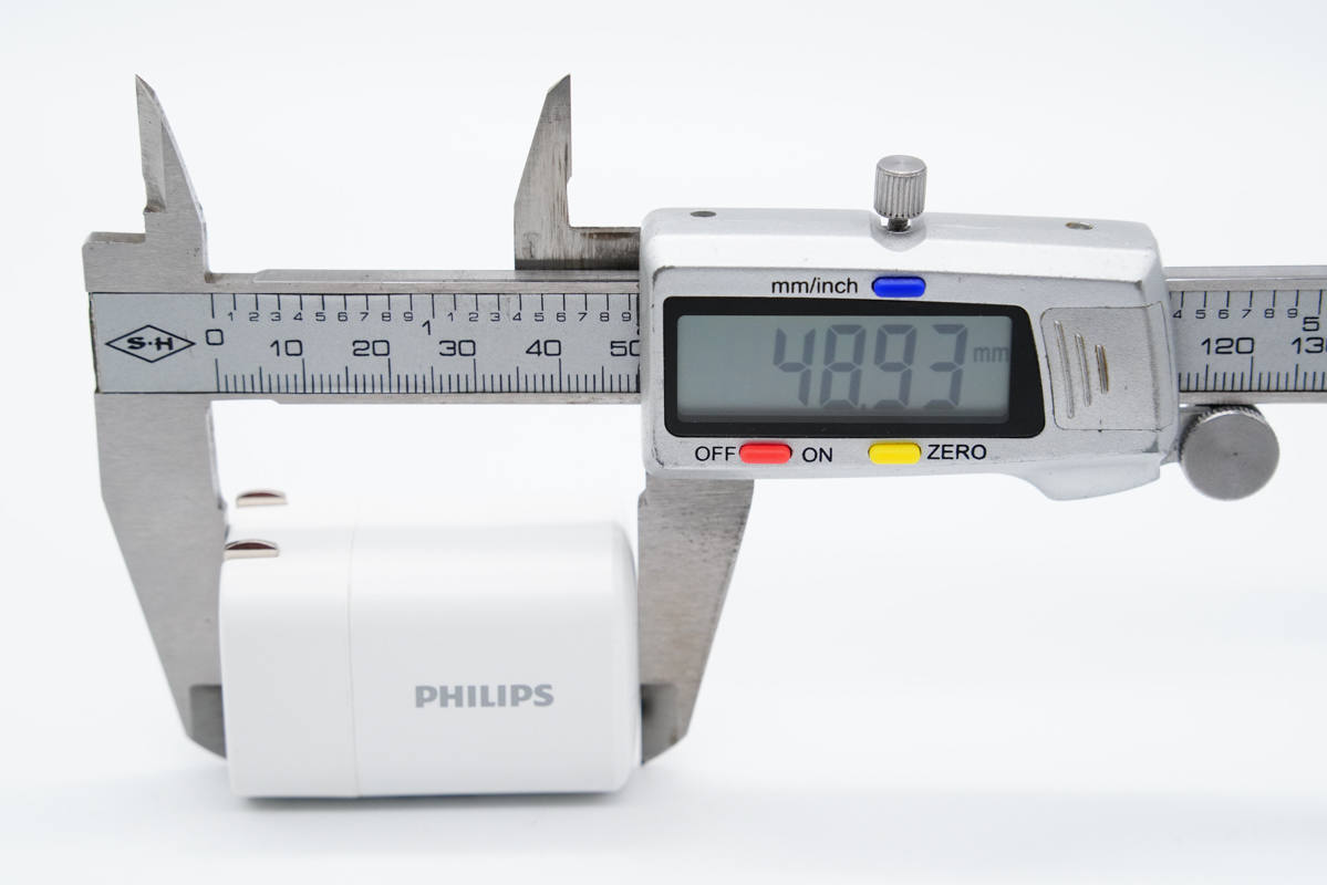 使用游标卡尺实测充电器机身长度为48.93mm。