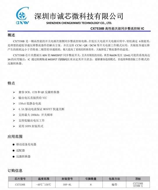 诚芯微CX7538B 支持开关电源的CCM/QR/DCM模式,非常适合3.3~12V快充同步整流使用,内置耐压60V,11mΩ的同步整流管,可提供3A输出。比肖特基效率最高提升6%,工作电压范围宽,外围元件非常简单,在宽电压应用时,外围只需一颗电容。