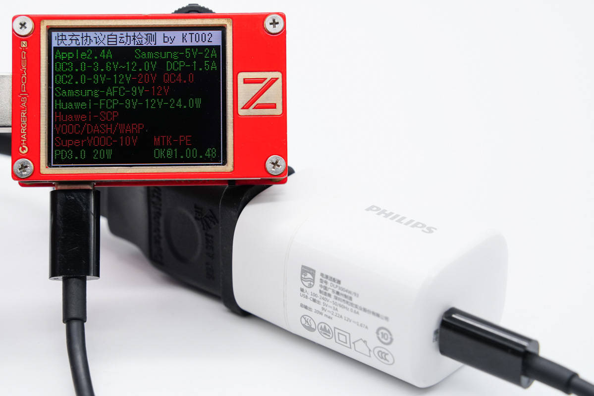 使用ChargerLAB POWER-Z KT002检测USB-C口输出协议,显示支持Apple 2.4A、Samsung 5V2A、DCP协议,以及QC2.0/3.0、AFC、FCP、PD3.0快充协议。