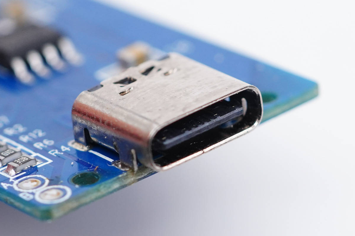 USB-C母座特写,过孔焊接。