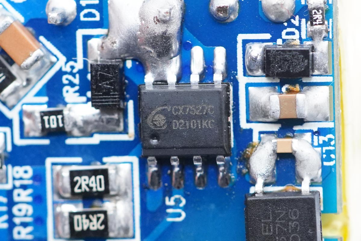 充电器主控芯片采用诚芯微CX7527C。这是一颗电流模式PWM控制芯片,内置650V超级硅MOS管,应用于功率在30W以内的方案。