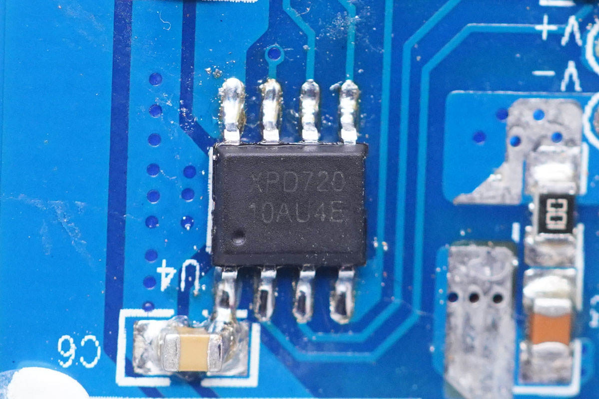 USB PD协议芯片采用云矽半导体XPD720,这款芯片已经通过了USB PD3.0认证,TID:3479,支持QC2.0、QC3.0、AFC、FCP、SCP、HVSCP、PD和PPS等快充协议,内部集成 10mΩ VBUS 通路功率开关管,并且集成10mΩ电流检测电阻,支持完善的保护功能,节省外围元件数量,简化电路,降低成本。采用ESOP8封装。