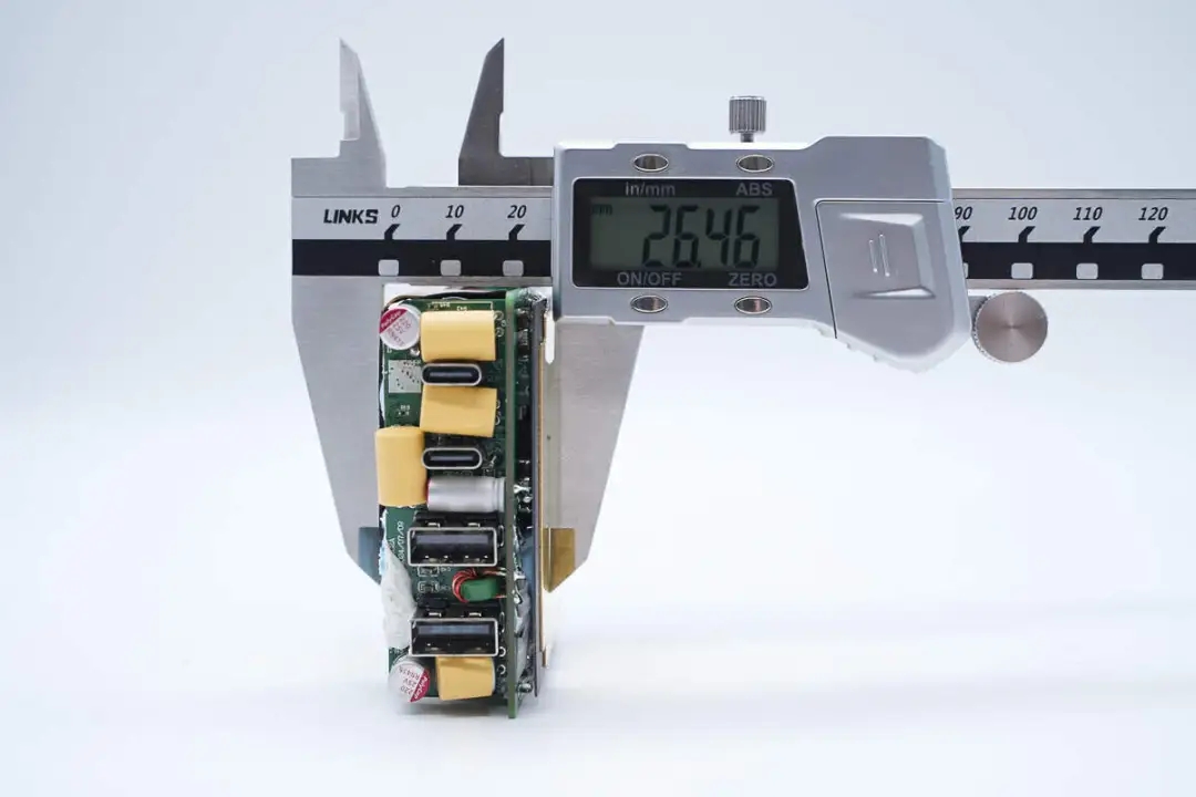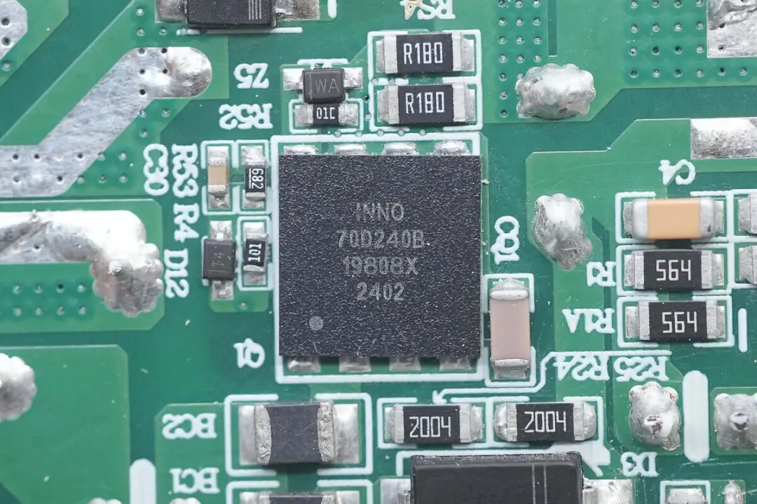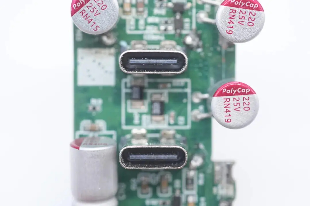 三路二次降压电路同步降压控制器均使用的英集芯IP6550,并使用英集芯IP2738和IP2726两颗协议芯片分别控制四个接口输出。采用承兴电解电容以及柏瑞凯固态电容进行滤波,PCBA模块填充导热胶以及覆盖散热片帮助散热,此外绝缘设计做的也很到位。