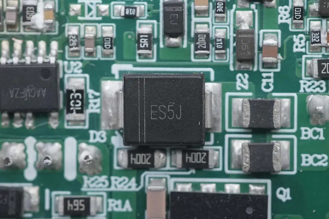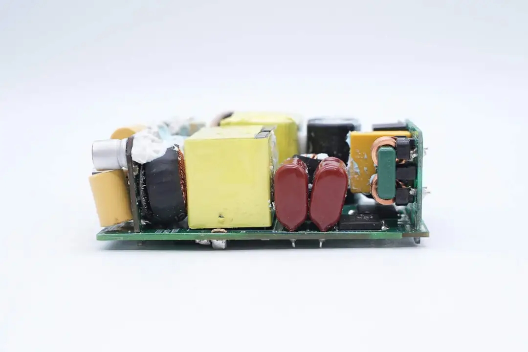 输出端垂直焊接一块小板,主板上设有同步整流输出滤波固态电容以及滤波电感。
