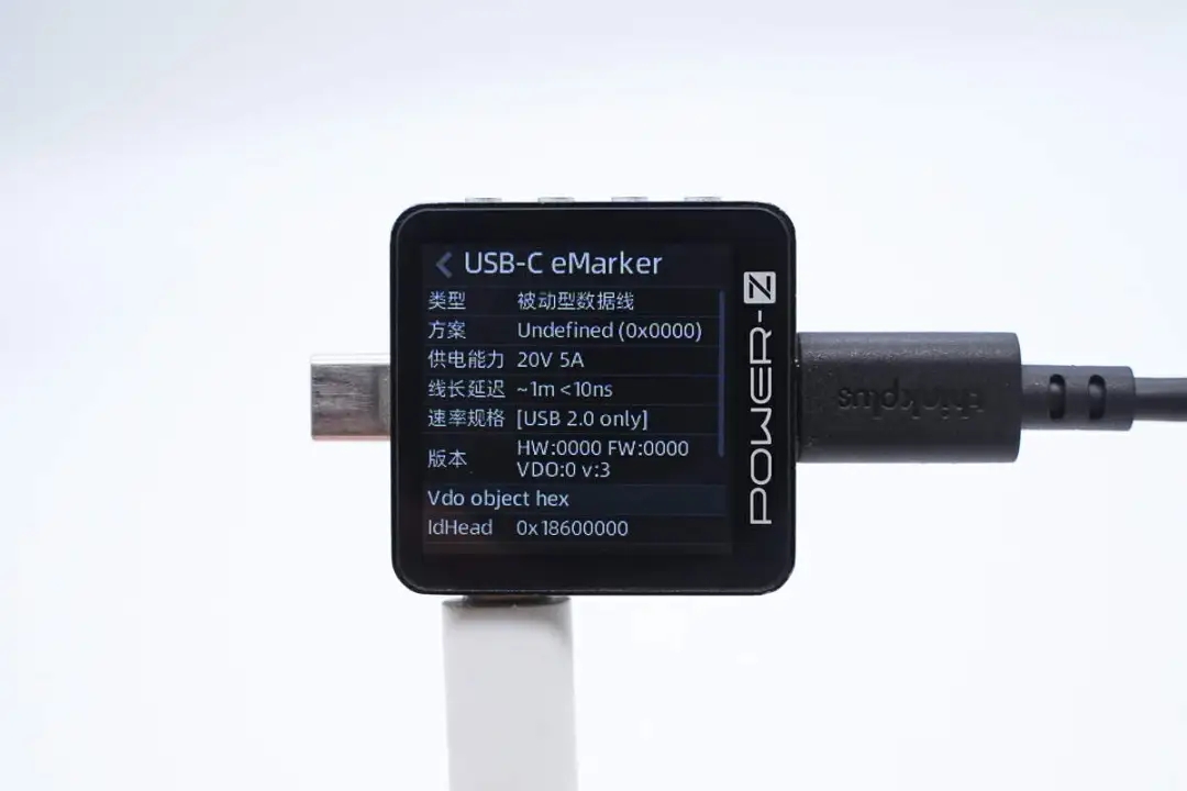 使用ChargerLAB POWER-Z KM003C测得该线缆带有E-Marker芯片,电力传输能力为20V5A,数据传输能力为USB 2.0。