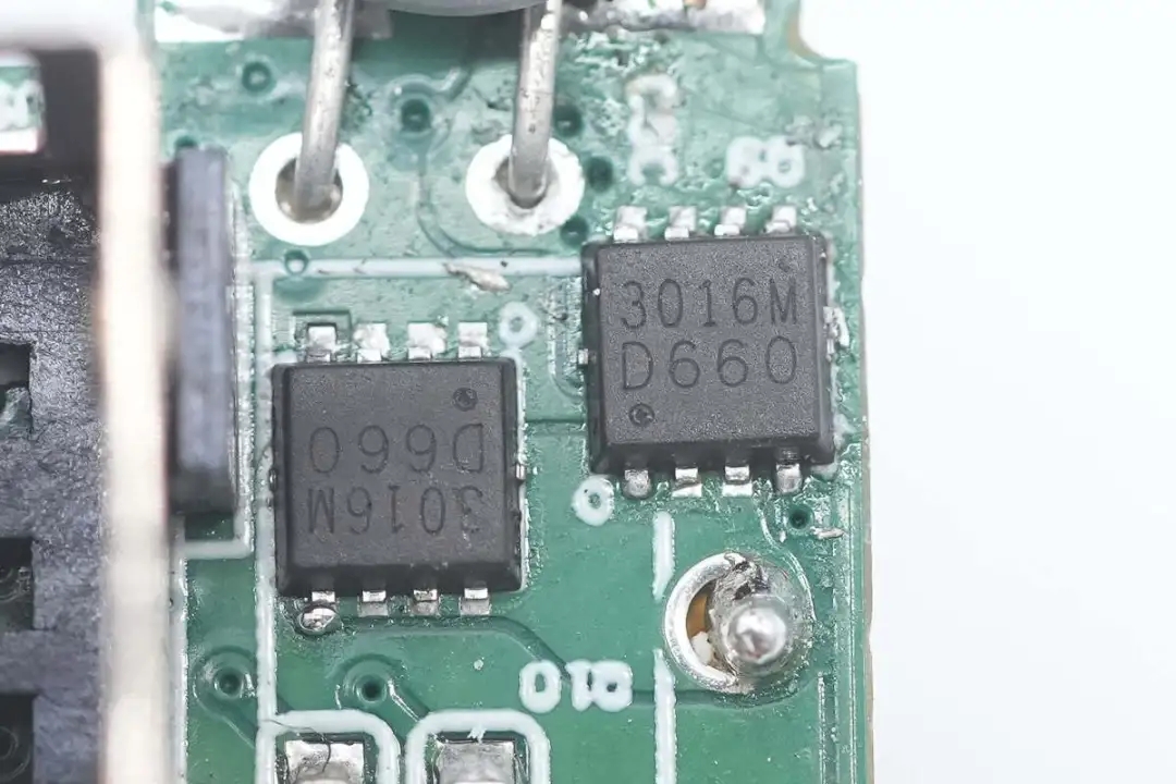 搭配的两颗同步降压开关管也是丝印3016M的MOS管。