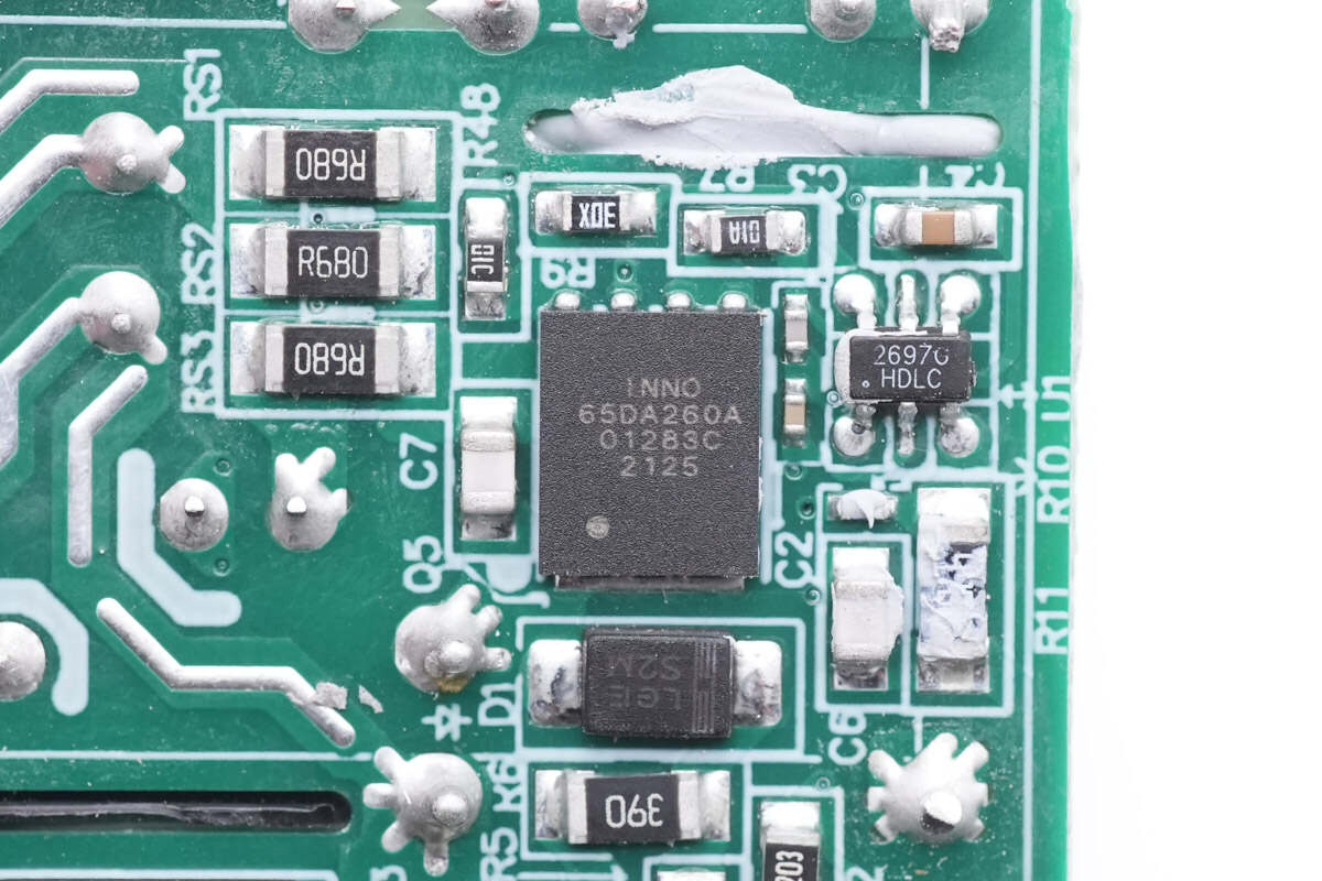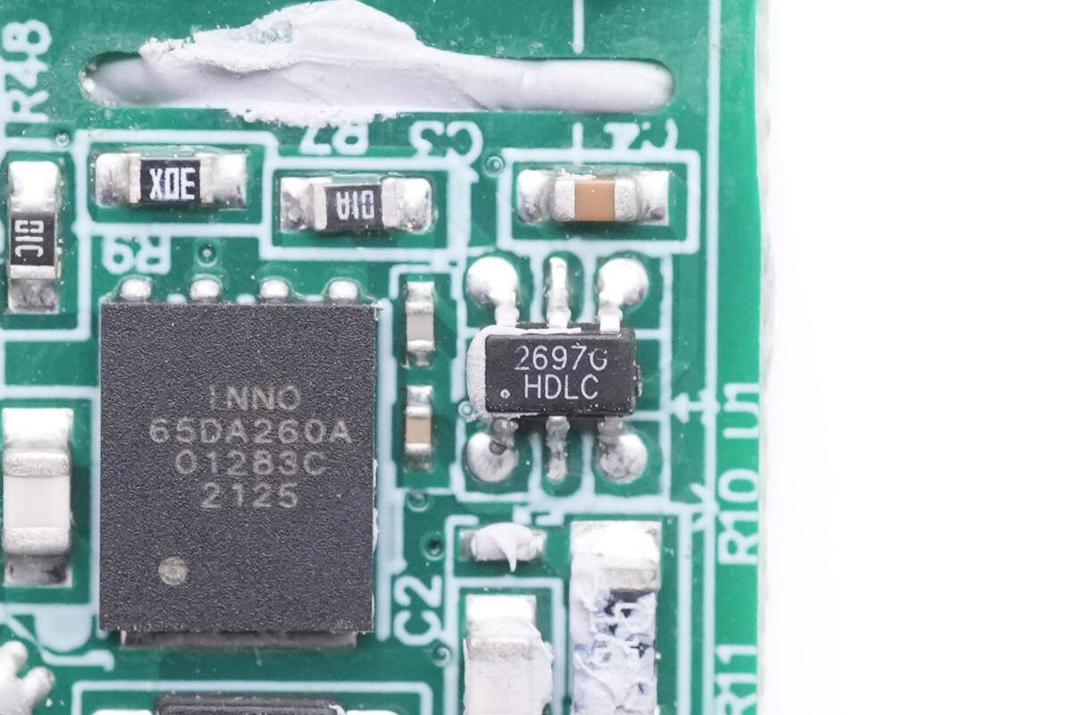 开关管来自英诺赛科,型号为INN650DA260A,这是一颗高性价比、耐压650V的氮化镓高压单管,瞬态耐压750V,得益于工艺改进,性能有明显的提升,适用于65-120W的反激架构,120-200W的LLC架构。