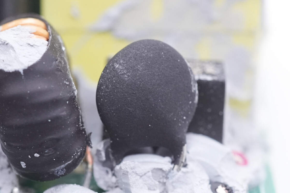 高压侧小板正面一览,焊接NTC热敏电阻,保险丝,共模电感,高压滤波电容和变压器等。