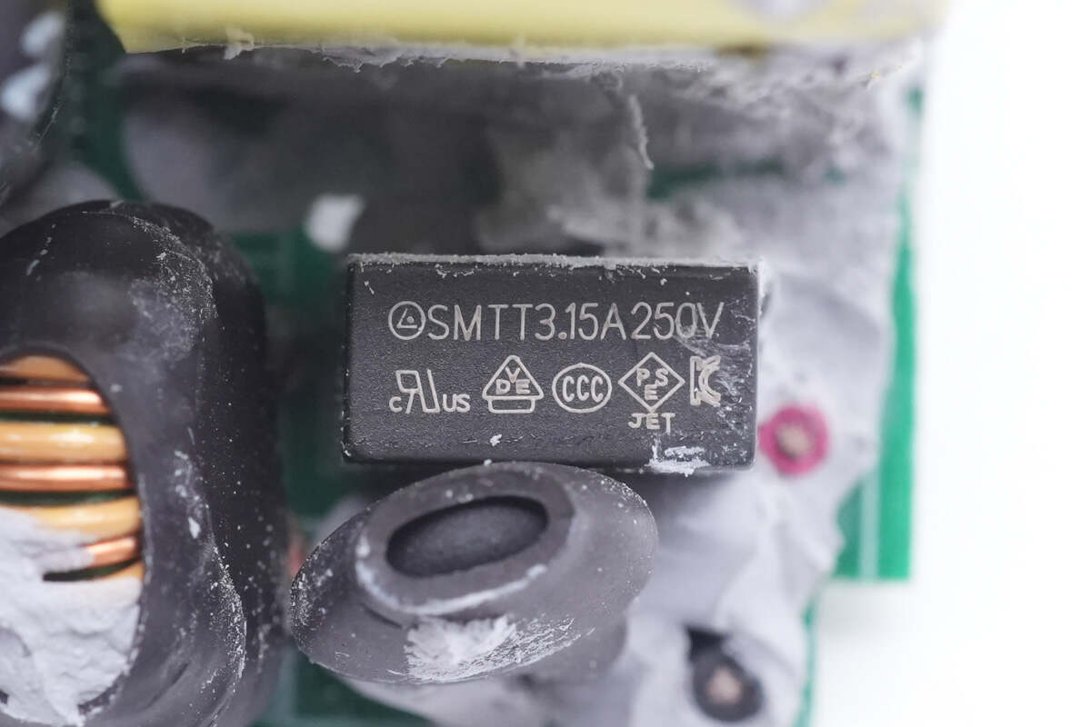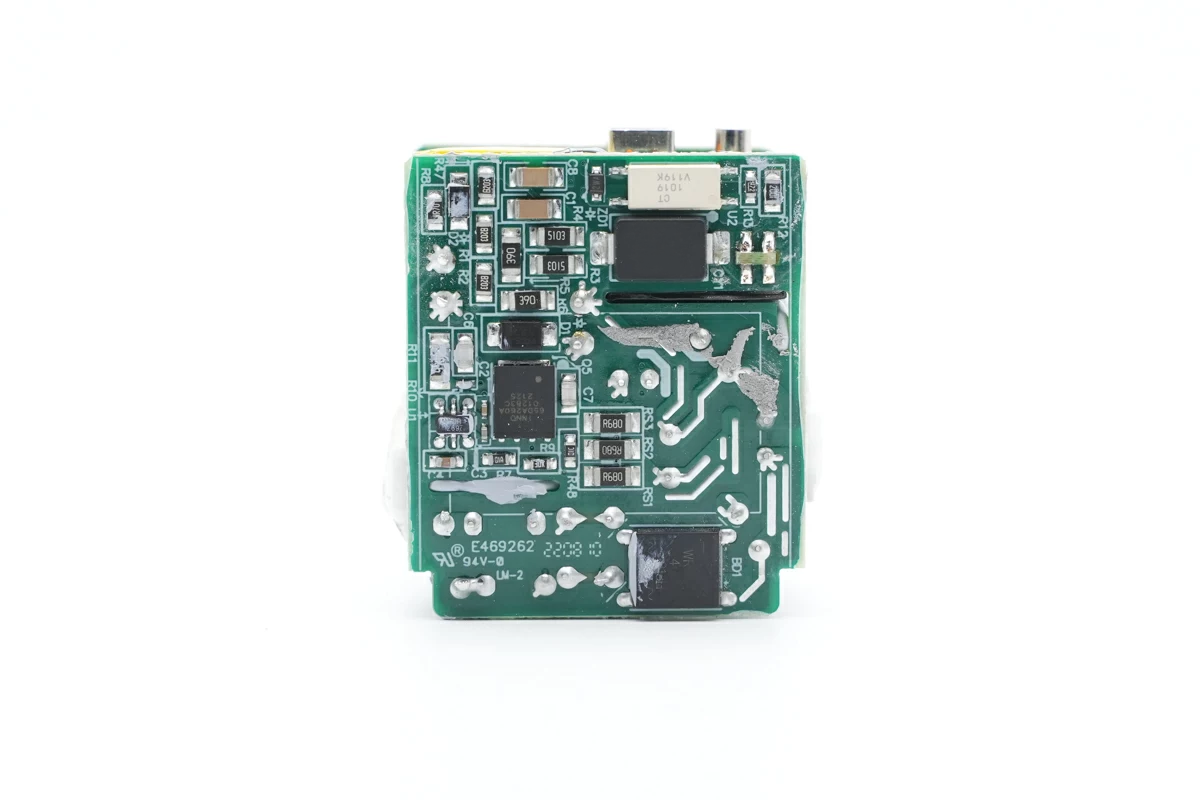 通过对PCBA模块的观察发现,这款充电器采用QR开关电源设计,宽电压范围输出,输出电压由协议芯片控制,通过光耦反馈,实现宽范围电压输出。USB-A口通过降压芯片,实现降压输出。下面我们就从输入端开始了解各个元器件的信息。