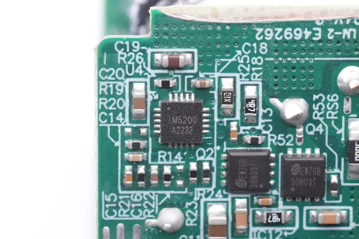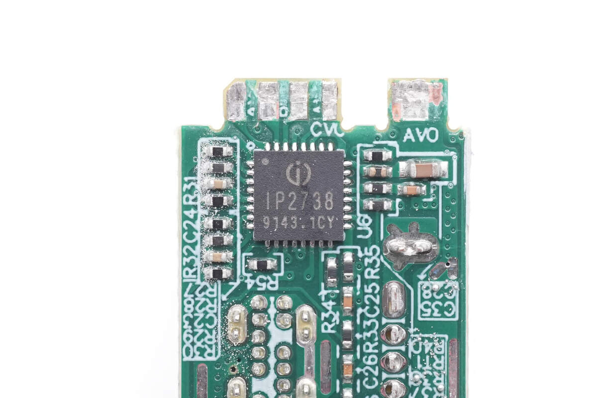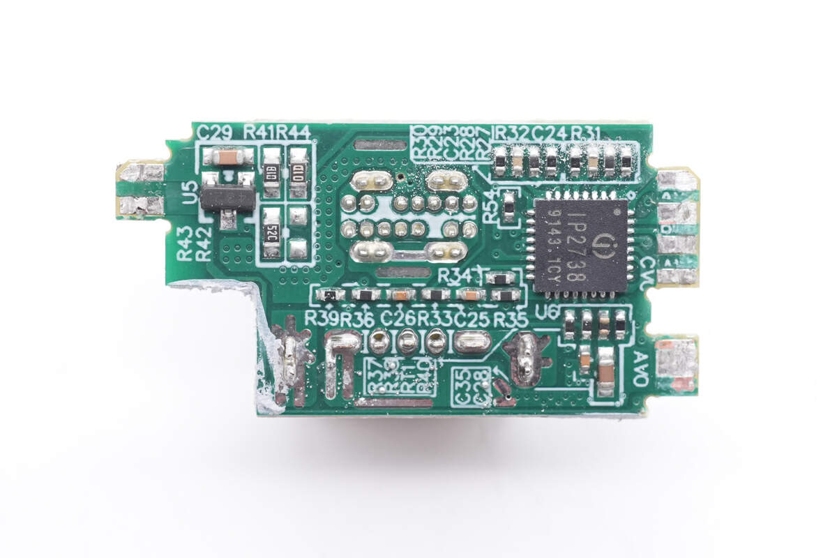 协议芯片采用英集芯IP2738,两个接口输出均由其控制。IP2738是一颗双路协议芯片,支持双口18-140W快充应用,具备独立的反馈控制,具备独立的USB PD控制,相当于两颗IP2736整合到一颗芯片内部,快充规格与IP2736相同。支持USB PD3.1 28V EPR档位,并支持PD3.0/PPS等丰富全面的快充协议,兼容性非常好。