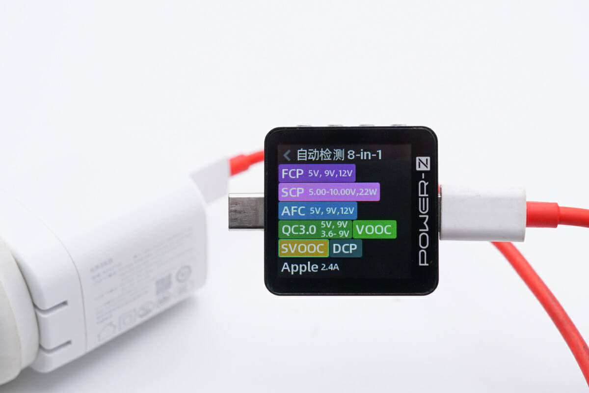 测得USB-A口支持FCP、SCP、AFC、 QC3.0、VOOC、SuperVOOC、DCP、Apple 2.4A充电协议。