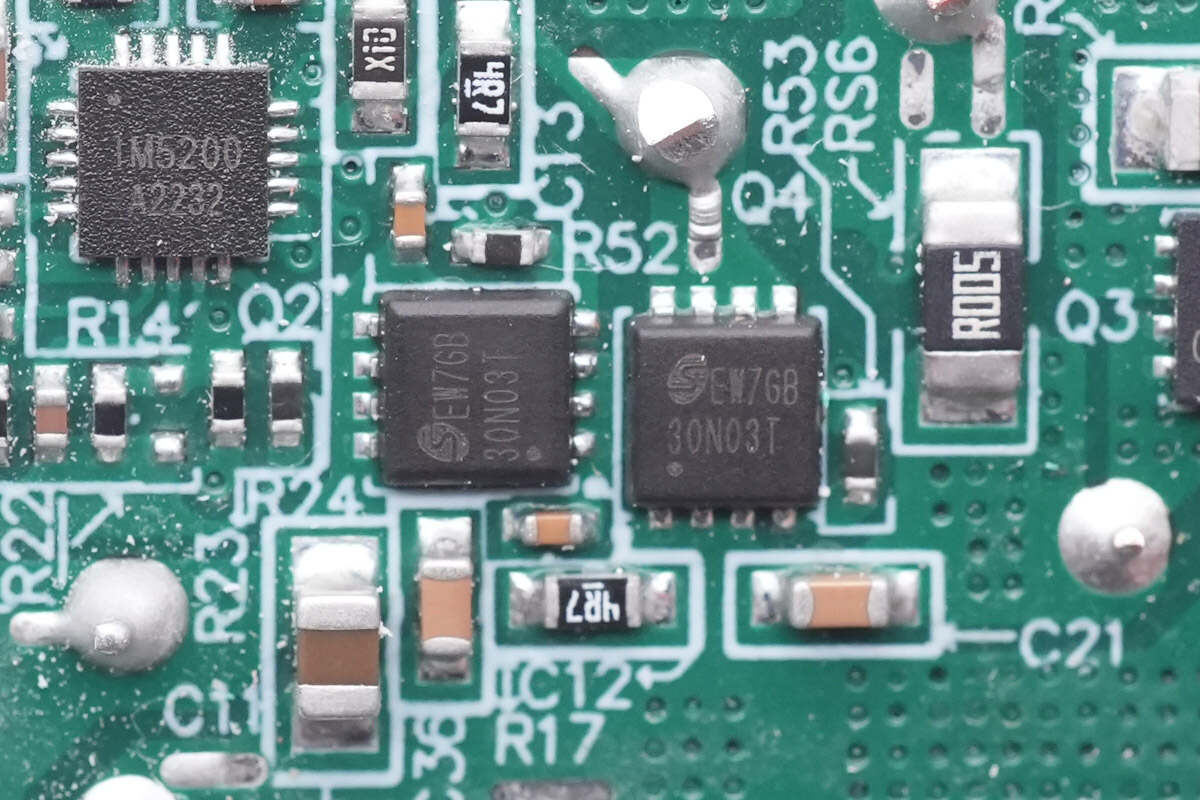 两颗同步降压开关管来自美浦森,型号SLN30N03T,是一颗耐压30V的NMOS,导阻为6mΩ,采用DFN3*3封装。