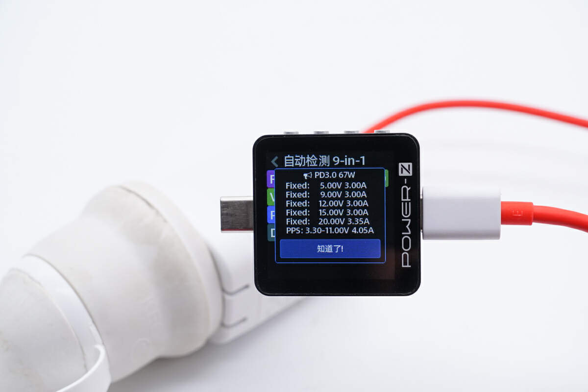 PDO报文方面,USB-C端口具备持 5V3A、9V3A、12V3A、15V3A 和 20V3.35A 五组固定电压,以及3.3V-11V4.05A一组PPS电压档位。