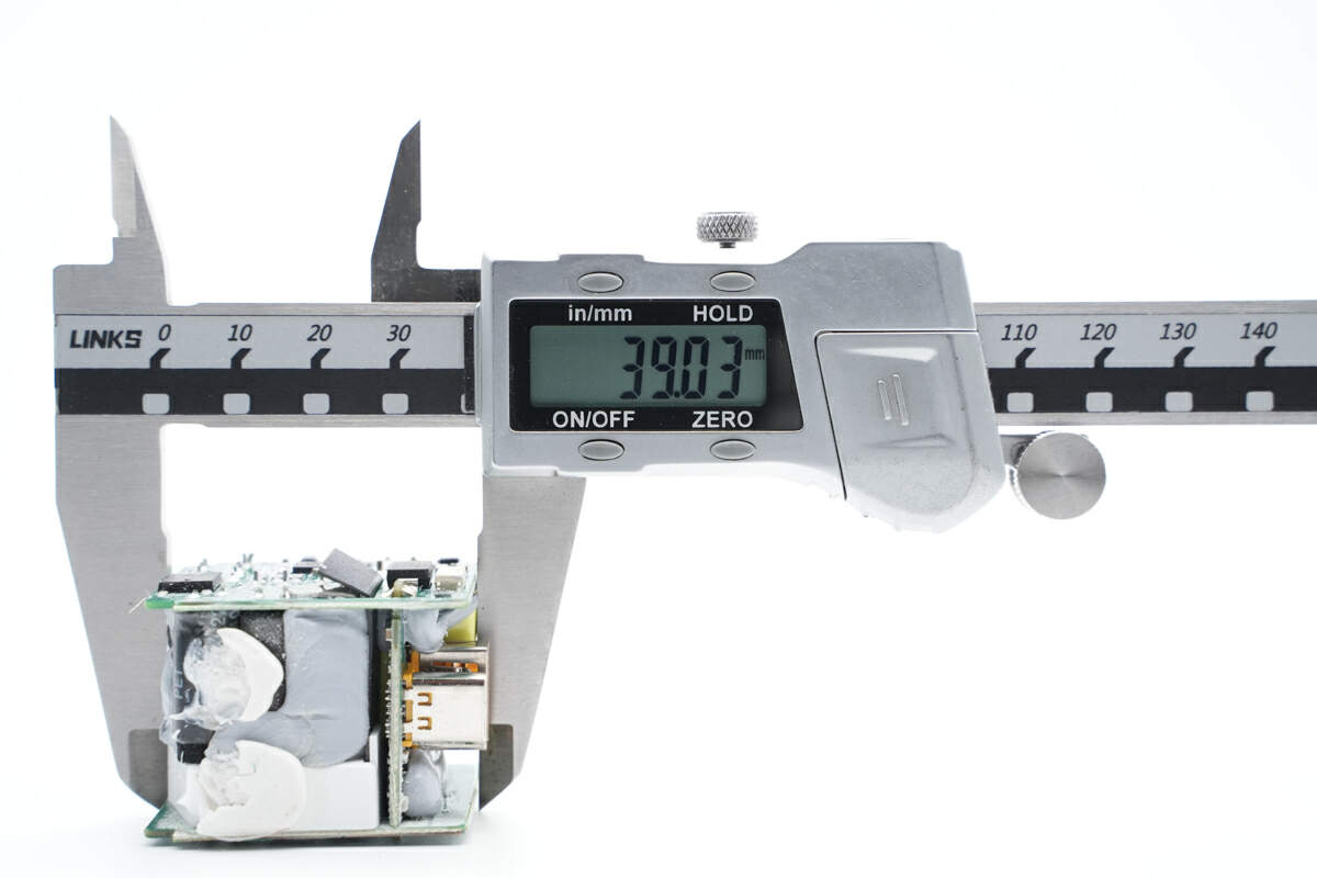 使用游标卡尺测得PCBA模块长度约为39.03mm。