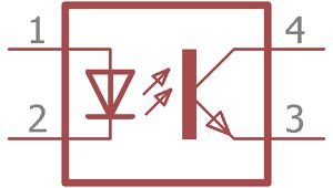 这是光耦合器的内部结构。左边1脚2脚裸露,是LED(Light Emitting Diode),LED发出红外光给光敏三极管在右侧。光电晶体管通过其集电极和发射极切换输出电路,与典型的BJT晶体管相同。LED的强度直接控制光电晶体管。由于LED可以由不同的电路控制,光电晶体管可以控制不同的电路,因此两个独立的电路可以由光耦合器控制。另外,在光电晶体管和红外线LED之间,空间是透明和不导电的材料;它电气隔离两个不同的电路。LED和光电晶体管之间的中空空间可以使用玻璃、空气或透明塑料制成,电气隔离要高得多,通常为10 kV或更高。
