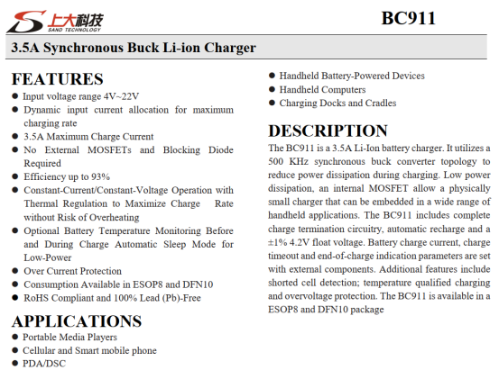 BC911是一款高集成度同步降压锂电池充电芯片,专为单节锂离子电池设计,输入电压范围4~22V,最大充电电流3.5A,适用于便携式媒体播放器、智能手机、PDA/DSC、手持设备及充电底座等场景。提供ESOP8与DFN10两种封装,工作结温-40℃~85℃,RoHS合规且无铅设计,适配不同量产与空间需求。