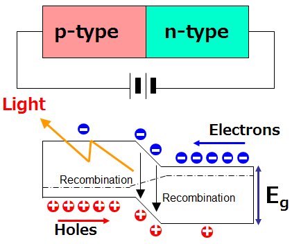 LED依靠发射光的波长不同来显示不同的颜色,LED不仅可以发射可见光,还可以产生紫外光乃至红外光。发射波长可通过“λ(nm)=1240/Eg(eV)”化合物半导体材料能隙(Eg)的等式进行表示。不同材料的LED,可发出不同的光线。具体而言,拥有较大能隙的材料发射较短的波长,拥有较小能隙的材料发射较长的波长。