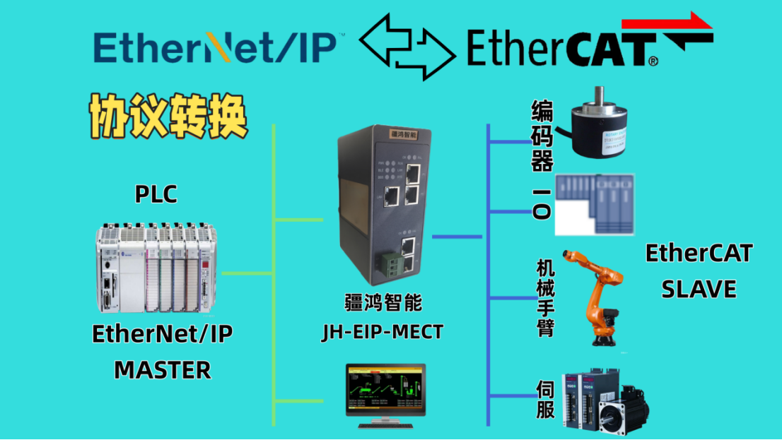 疆鸿智能JH-EIP-MECT型网关EtherNet/IP网络与EtherCAT网络之间的数据通讯,即EtherNet/IP和EtherCAT网络之间无缝内部连接。