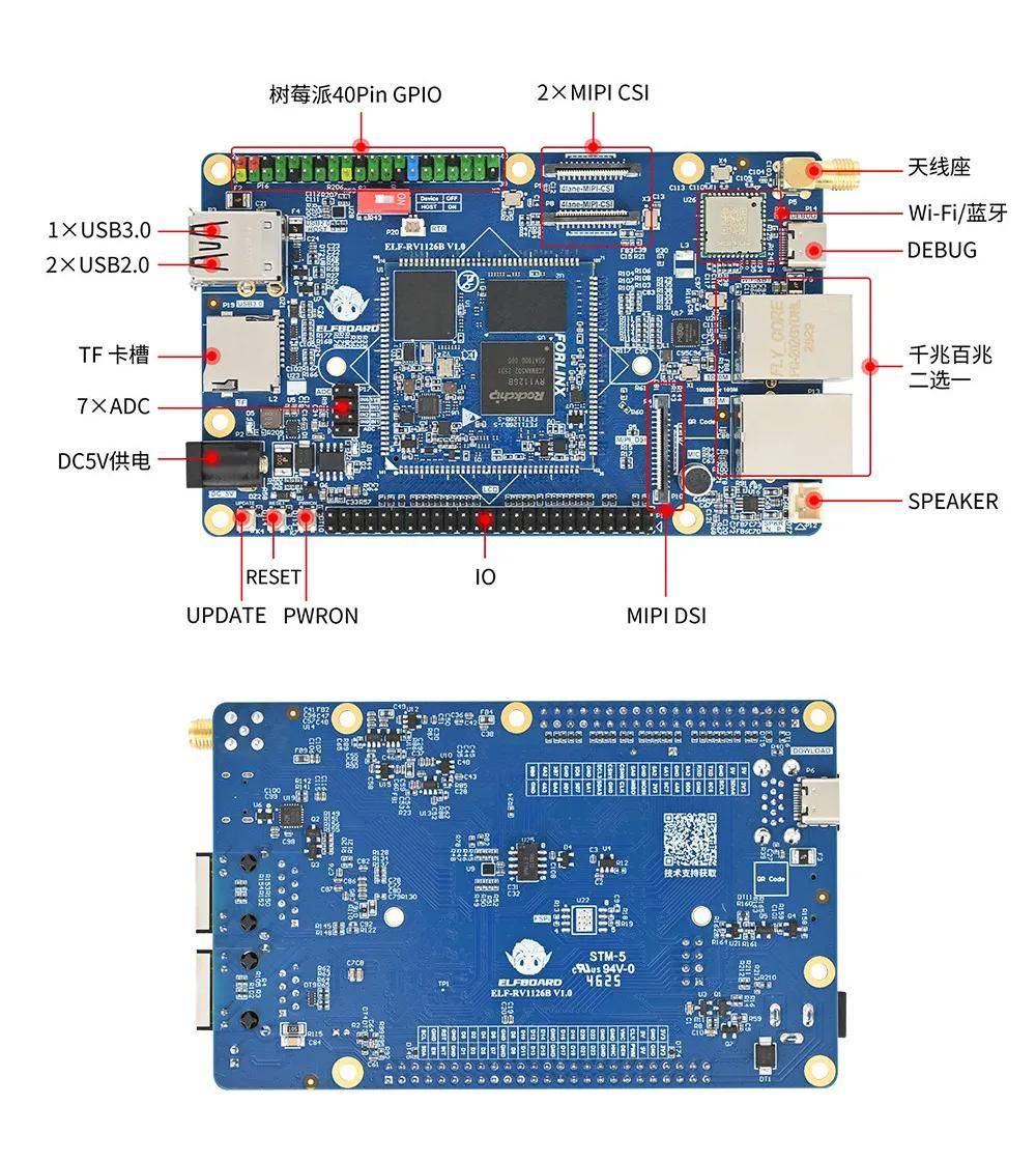 开发板尺寸紧凑(120mm×75mm),便携易操作,同时提供丰富外设接口,含2路网口、显示接口、USB、Wi-Fi等,且兼容树莓派40Pin GPIO定义。