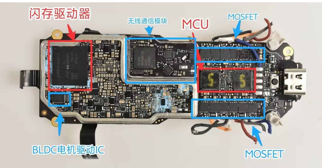 可以看到电控板正面有2颗MCU,12颗MOSFET,1个嵌入式闪存驱动器,1颗BLDC电机驱动IC,还有一个由四颗芯片负责无线通信的板块。