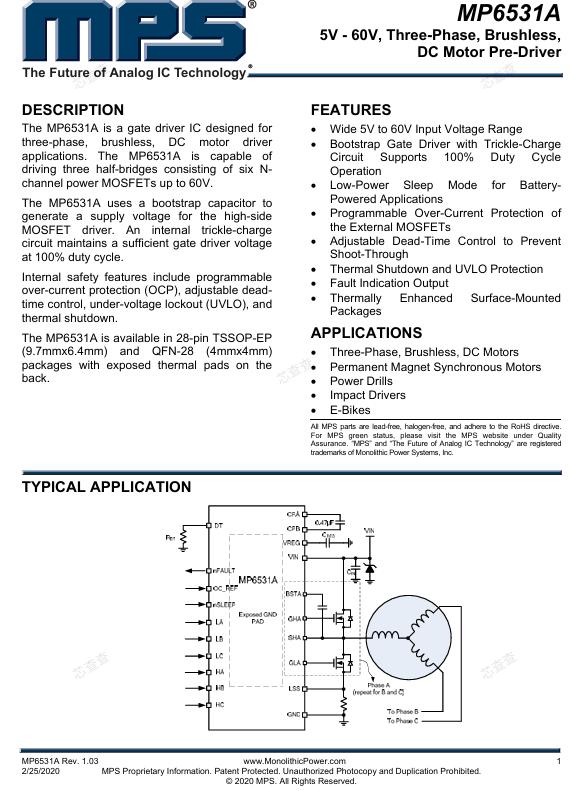 四颗栅极驱动芯片是MPS(芯源)的MP6531A,该芯片是专门为三相直流无刷电机前置驱动器设计的栅极驱动器IC,封装方式为DFN-8(3x3),能驱动由6颗60V N通道功率MOSFET组成的三个半桥,支持 -55℃~150℃ 宽温工作,满足无人机户外复杂环境的可靠性要求。