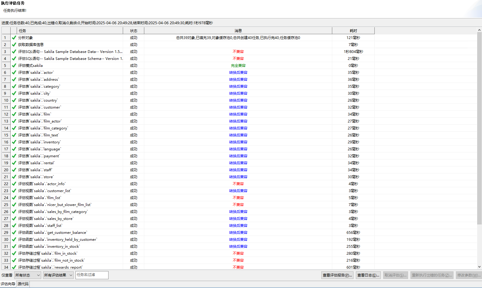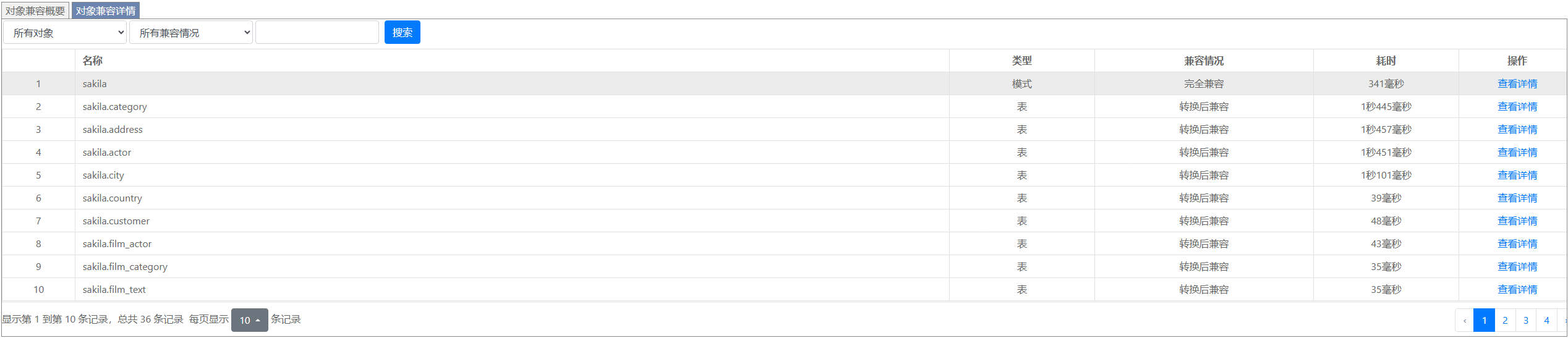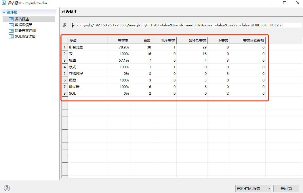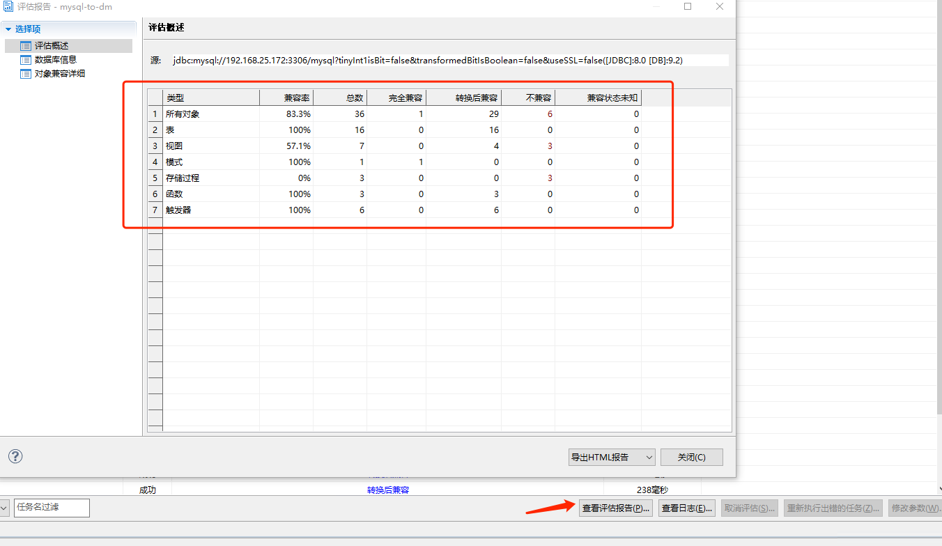 选择“查看迁移评估报告”弹出一个新的页面,以表格的形式展示所有对象的兼容率,不兼容等信息,如下图所示