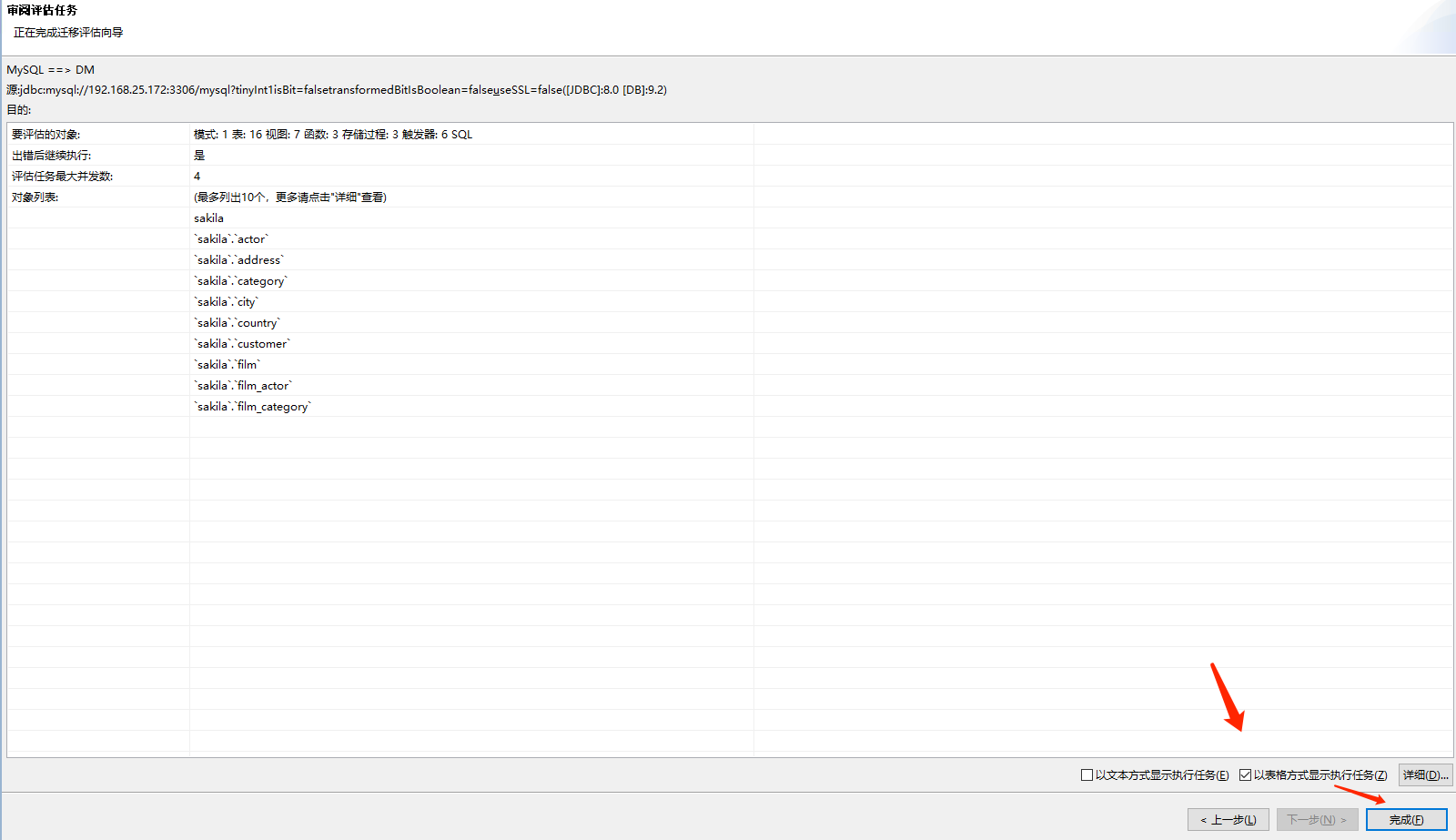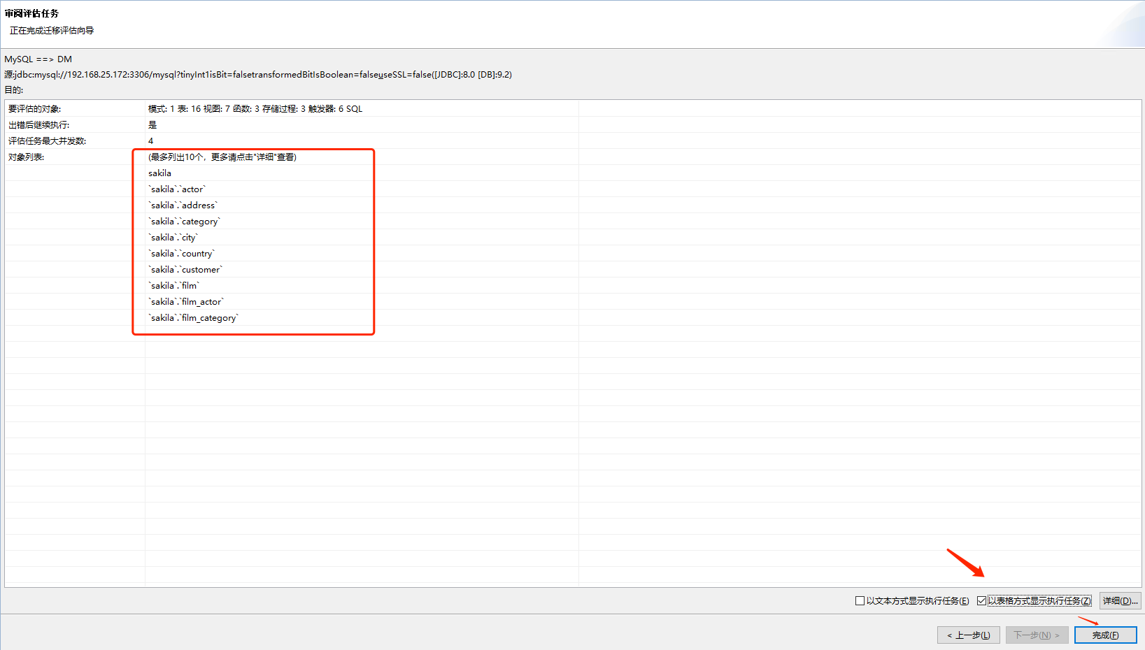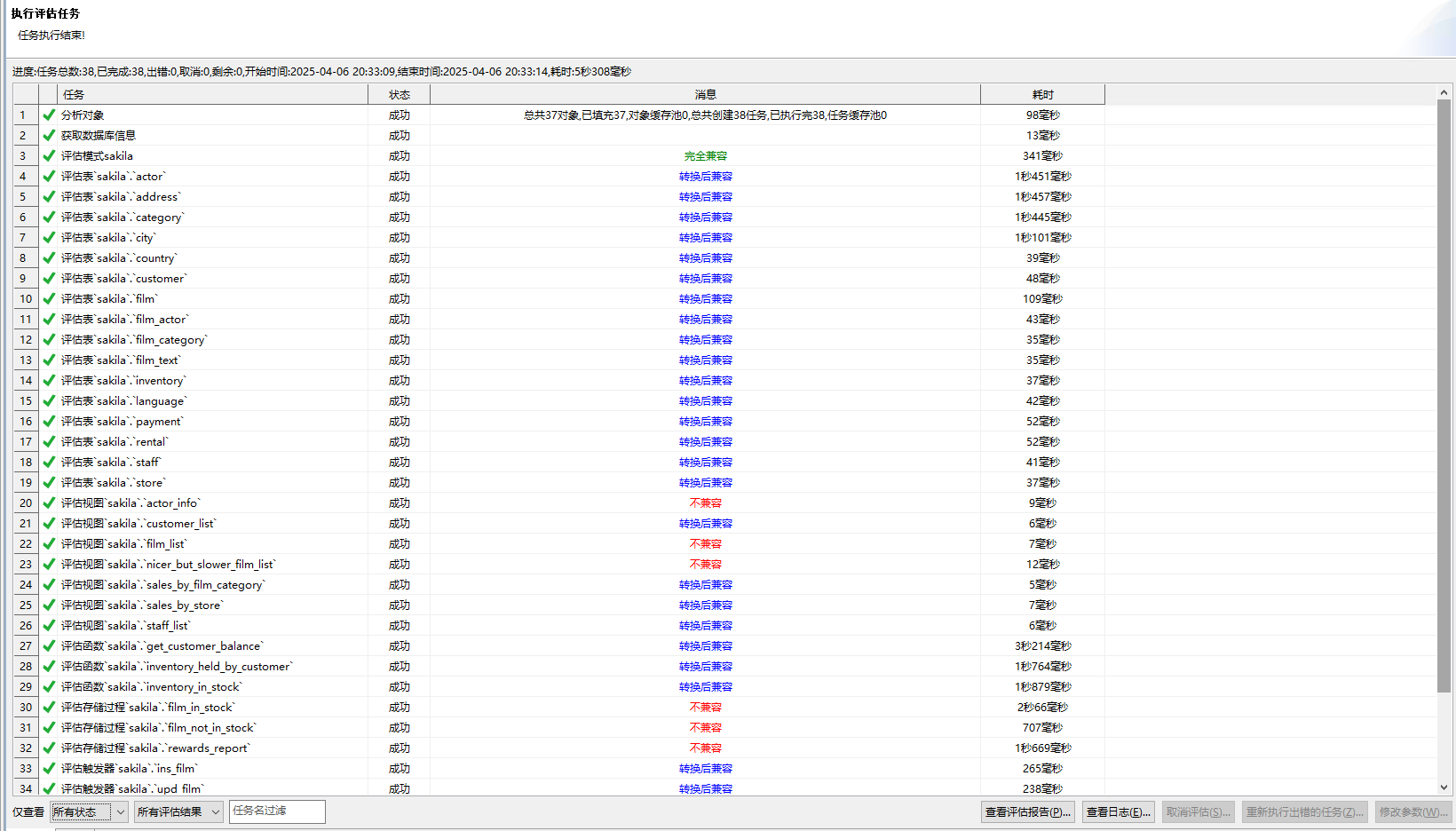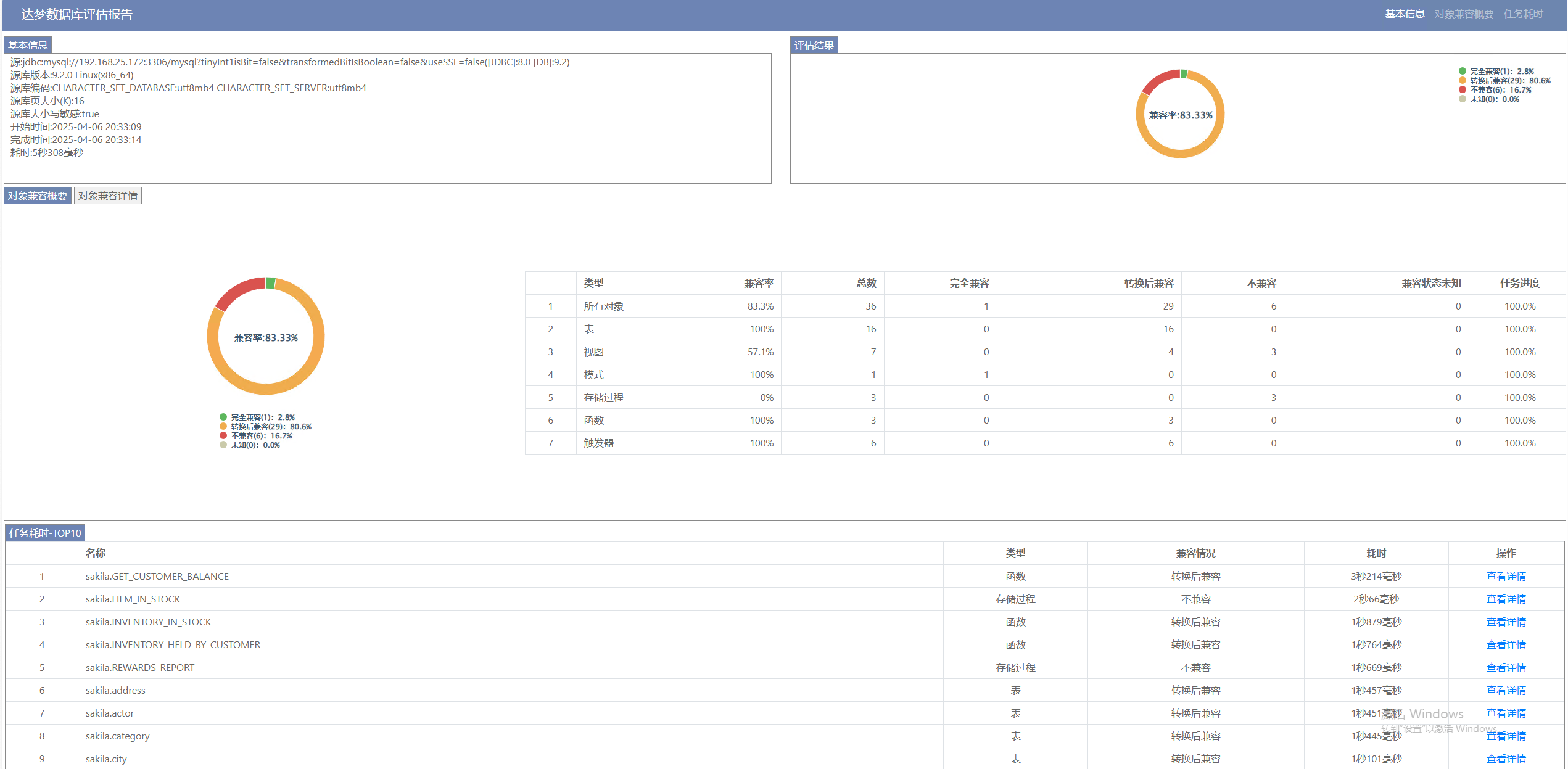 选择“查看迁移评估报告”弹出一个新的页面,以表格的形式展示所有对象的兼容率,不兼容等信息,如下图所示