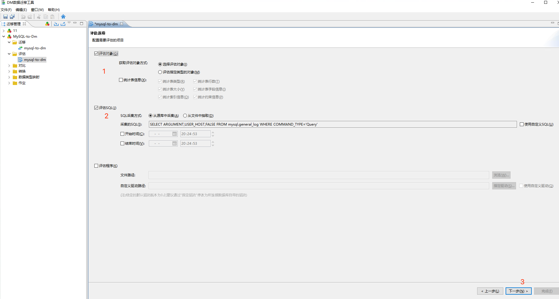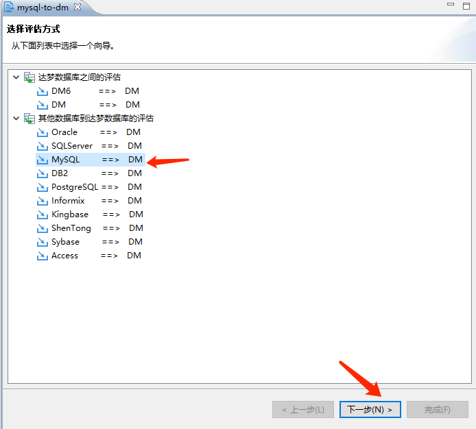 本次演示的是mysql文件迁移到达梦,选择mysql然后进入到下一步。