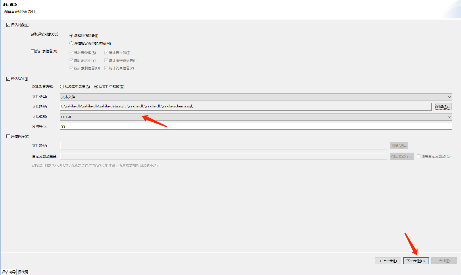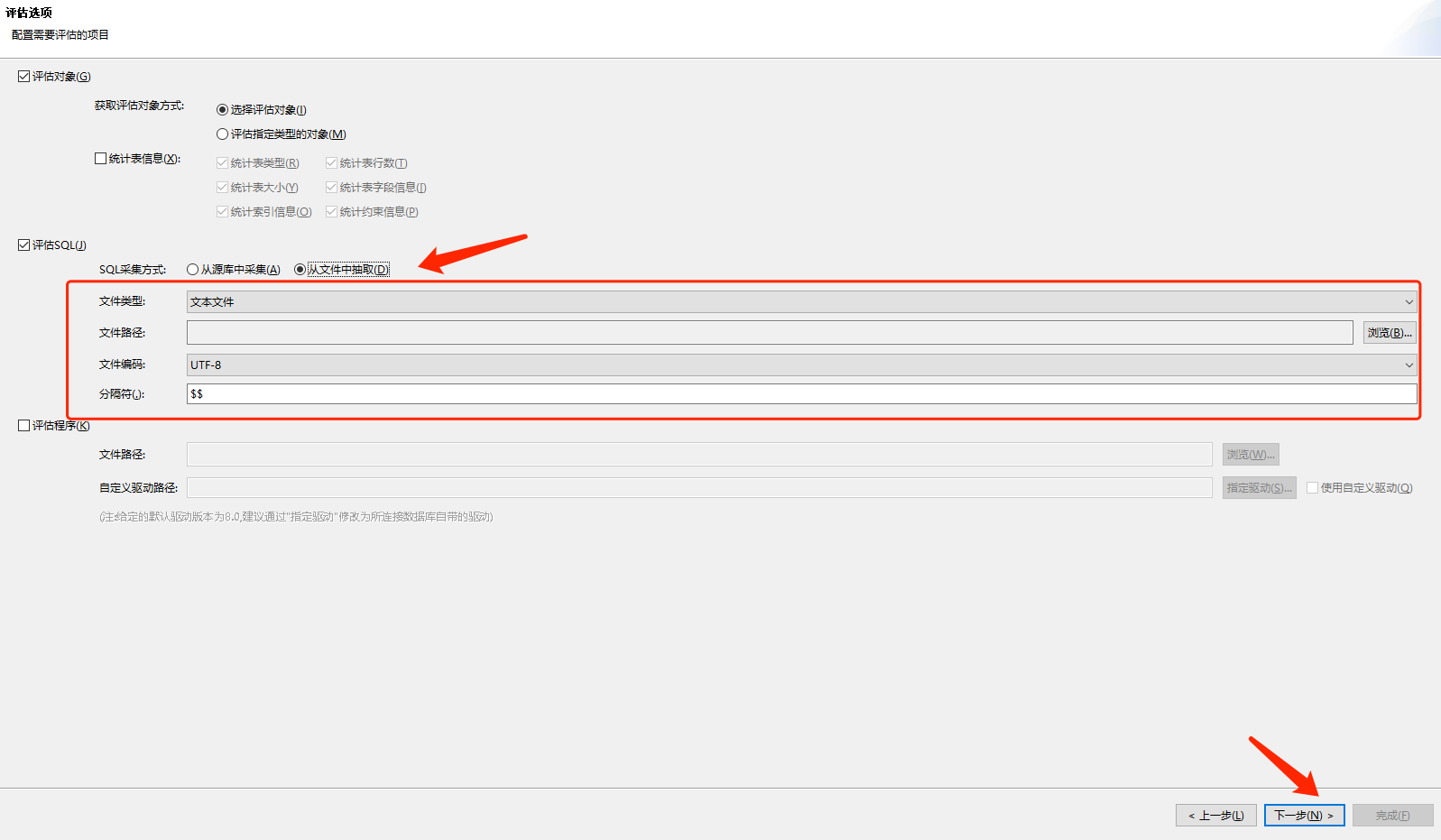 评估选项有两种方式,分别是从源库中采集或者从文件中抽取。这里先演示从源库抽取比对,如下图所示: