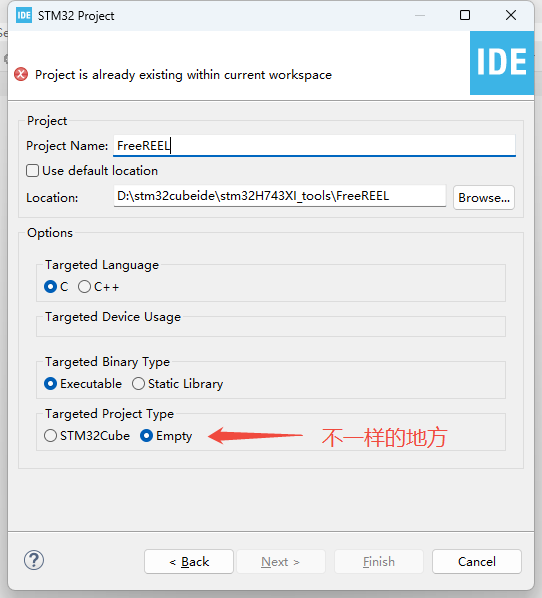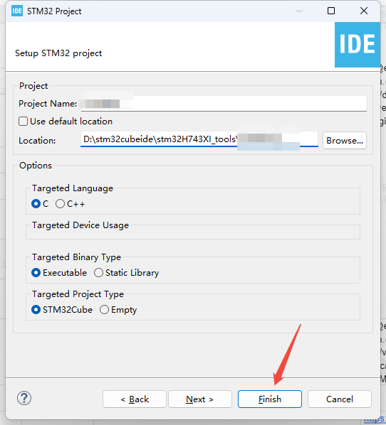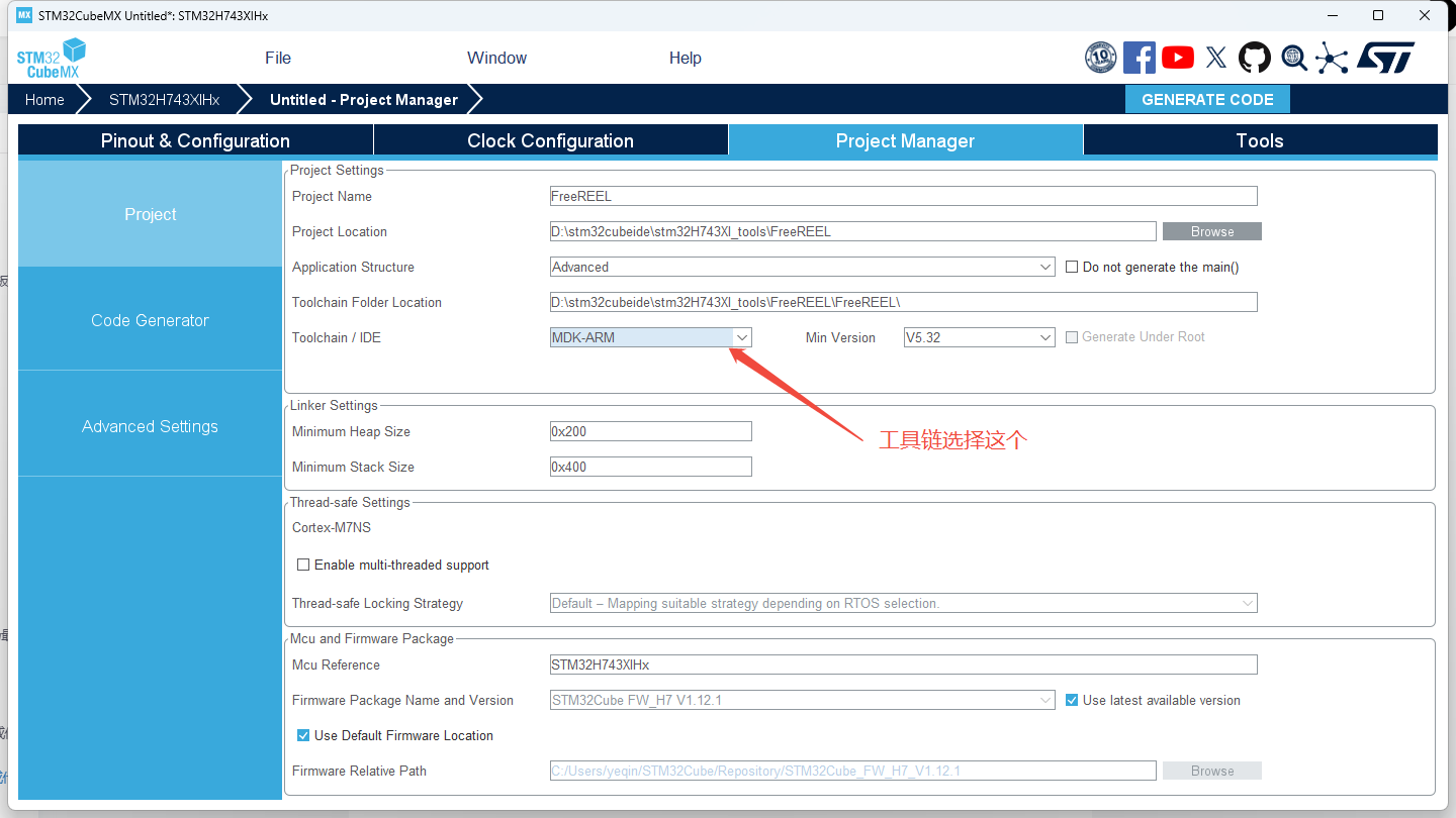 注意:这里的工具链选择STM32Cude,最后会改为其它,所以这里也可以选择空!