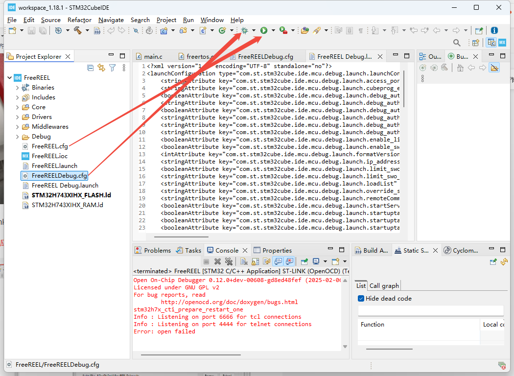 Open On-Chip Debugger 0.12.0+dev-00608-gd8ed48fef (2025-02-06-11:17) [https://github.com/STMicroelectronics/OpenOCD]Licensed under GNU GPL v2For bug reports, read http://openocd.org/doc/doxygen/bugs.htmlstm32h7x_cti_prepare_restart_oneInfo : Listening on port 6666 for tcl connectionsInfo : Listening on port 4444 for telnet connectionsError: open failed