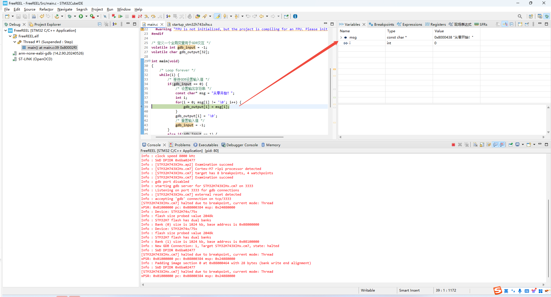 Open On-Chip Debugger 0.12.0+dev-00608-gd8ed48fef (2025-02-06-11:17) [https://github.com/STMicroelectronics/OpenOCD]Licensed under GNU GPL v2For bug reports, read http://openocd.org/doc/doxygen/bugs.htmlstm32h7x_cti_prepare_restart_oneInfo : Listening on port 6666 for tcl connectionsInfo : Listening on port 4444 for telnet connectionsInfo : CMSIS-DAP: SWD supportedInfo : CMSIS-DAP: JTAG supportedInfo : CMSIS-DAP: Atomic commands supportedInfo : CMSIS-DAP: Test domain timer supportedInfo : CMSIS-DAP: FW Version = 2.0.0Info : CMSIS-DAP: Interface Initialised (SWD)Info : SWCLK/TCK = 0 SWDIO/TMS = 1 TDI = 0 TDO = 1 nTRST = 0 nRESET = 0Info : Connecting under resetInfo : CMSIS-DAP: Interface readyInfo : clock speed 8000 kHzInfo : SWD DPIDR 0x6ba02477Info : [STM32H743XIHx.ap2] Examination succeedInfo : [STM32H743XIHx.cm7] Cortex-M7 r1p1 processor detectedInfo : [STM32H743XIHx.cm7] target has 8 breakpoints, 4 watchpointsInfo : [STM32H743XIHx.cm7] Examination succeedInfo : gdb port disabledInfo : starting gdb server for STM32H743XIHx.cm7 on 3333Info : Listening on port 3333 for gdb connectionsInfo : [STM32H743XIHx.cm7] external reset detectedInfo : accepting 'gdb' connection on tcp/3333[STM32H743XIHx.cm7] halted due to breakpoint, current mode: Thread xPSR: 0x01000000 pc: 0x0800053c msp: 0x2000e838Info : Device: STM32H74x/75xInfo : flash size probed value 2048kInfo : STM32H7 flash has dual banksInfo : Bank (0) size is 1024 kb, base address is 0x08000000Info : Device: STM32H74x/75xInfo : flash size probed value 2048kInfo : STM32H7 flash has dual banksInfo : Bank (1) size is 1024 kb, base address is 0x08100000Info : New GDB Connection: 1, Target STM32H743XIHx.cm7, state: haltedInfo : SWD DPIDR 0x6ba02477[STM32H743XIHx.cm7] halted due to breakpoint, current mode: Thread xPSR: 0x01000000 pc: 0x0800053c msp: 0x2000e838Info : Padding image section 0 at 0x0800039c with 4 bytes (bank write end alignment)Info : SWD DPIDR 0x6ba02477[STM32H743XIHx.cm7] halted due to breakpoint, current mode: Thread xPSR: 0x01000000 pc: 0x080002e0 msp: 0x24080000Info : dropped 'gdb' connectionshutdown command invoked