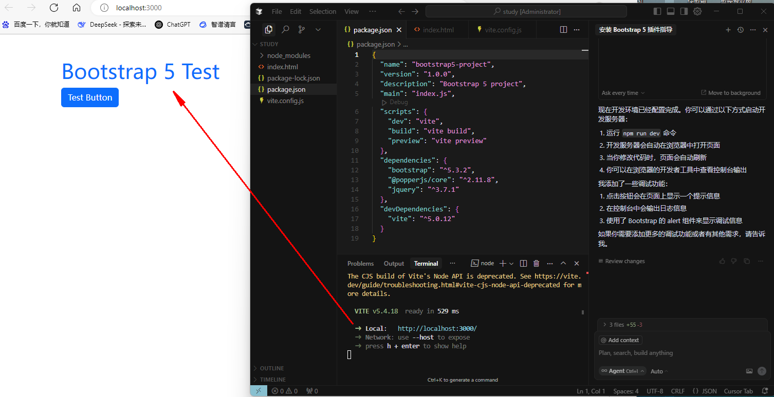 从配置中看,前端服务器使用了vite来构建。 - 当运行 `npm run dev` 时,实际上执行的是 `vite` 命令(根据 package.json 中的配置) - Vite 会启动一个开发服务器,默认端口通常是 3000 或 5173 - Bootstrap 5.3.2(UI 框架) - Popper.js 2.11.8(Bootstrap 的依赖,用于弹出组件) - jQuery 3.7.1 - Vite 5.0.12(开发服务器和构建工具) - Vite 会监听项目文件的变化 - 当修改 HTML、CSS 或 JavaScript 文件时,浏览器会自动刷新或热更新 - 比如修改 index.html 中的内容,变化会立即反映在浏览器中 - Vite 会自动处理项目中的静态资源 - Bootstrap CSS 和 JS 文件会被正确地引入和处理 - 当前项目中的 Bootstrap 资源引用: