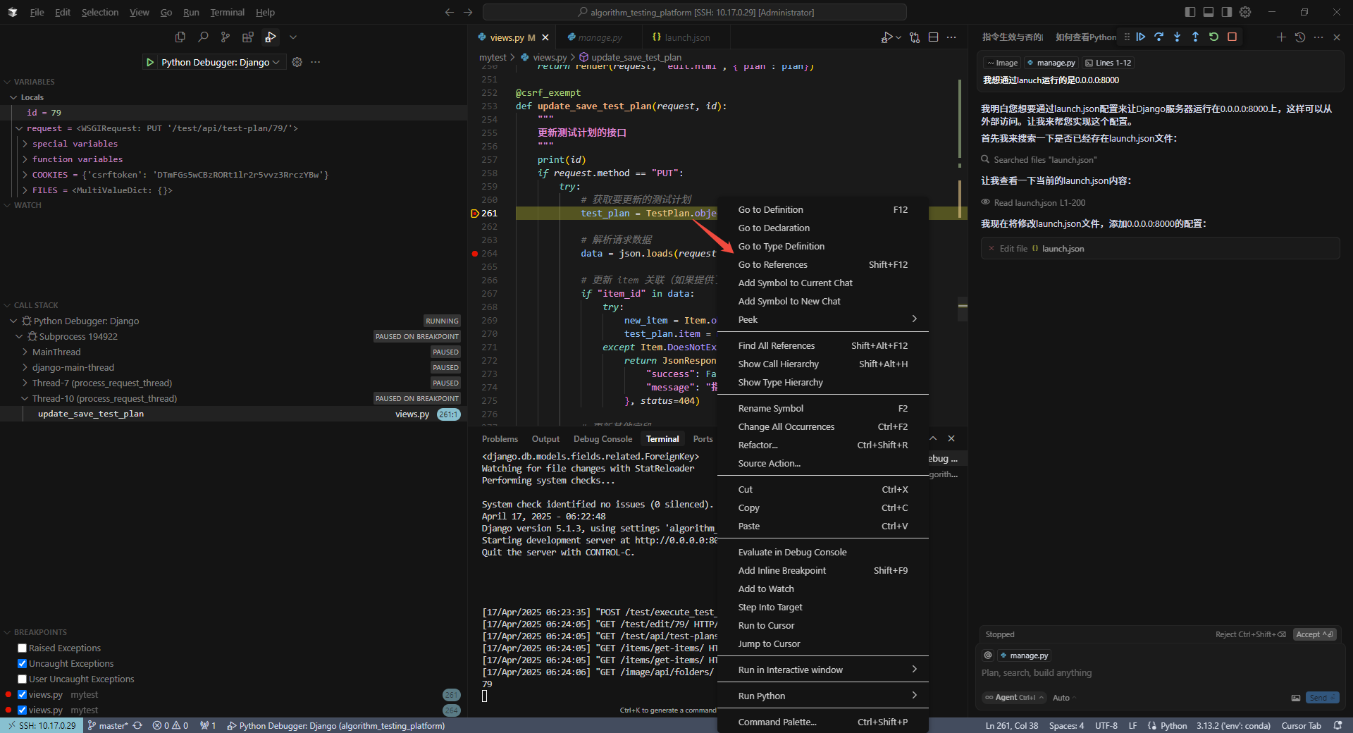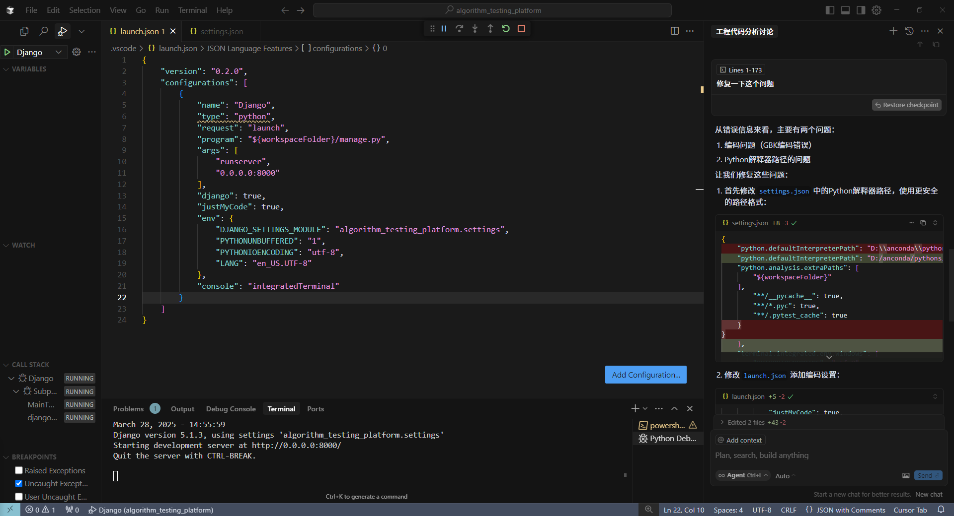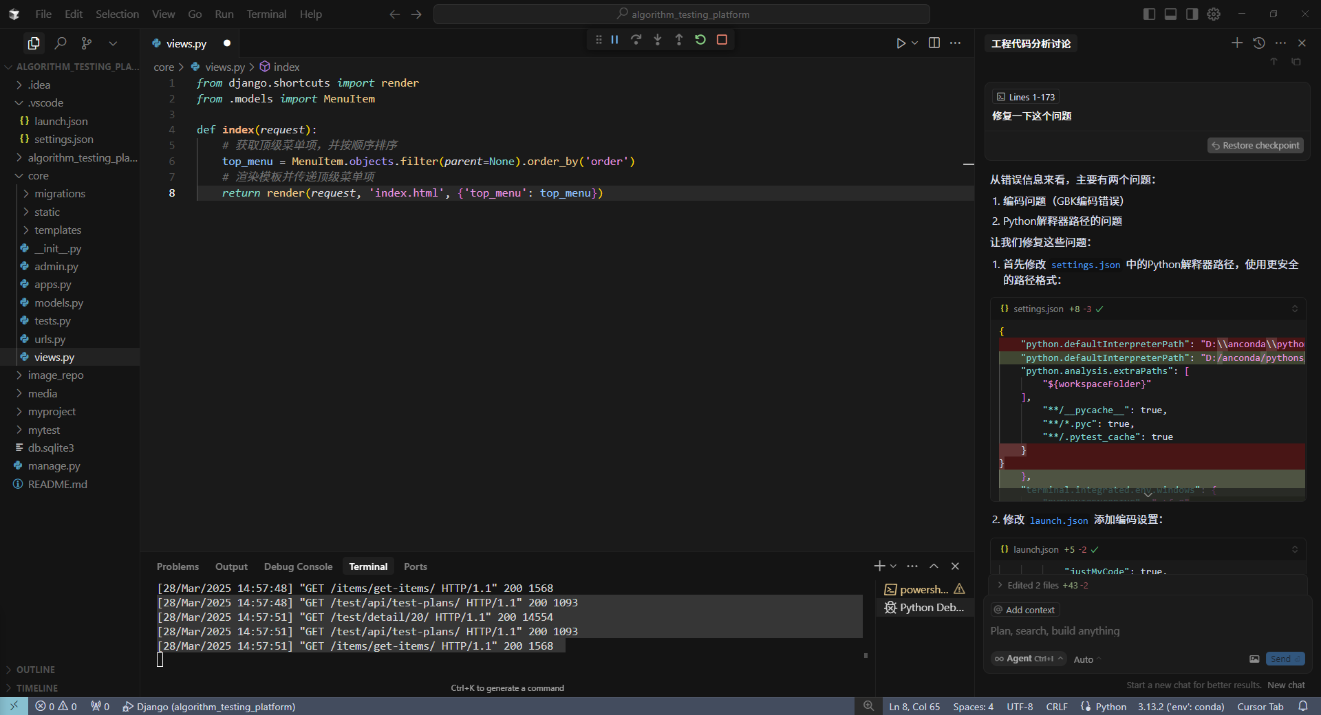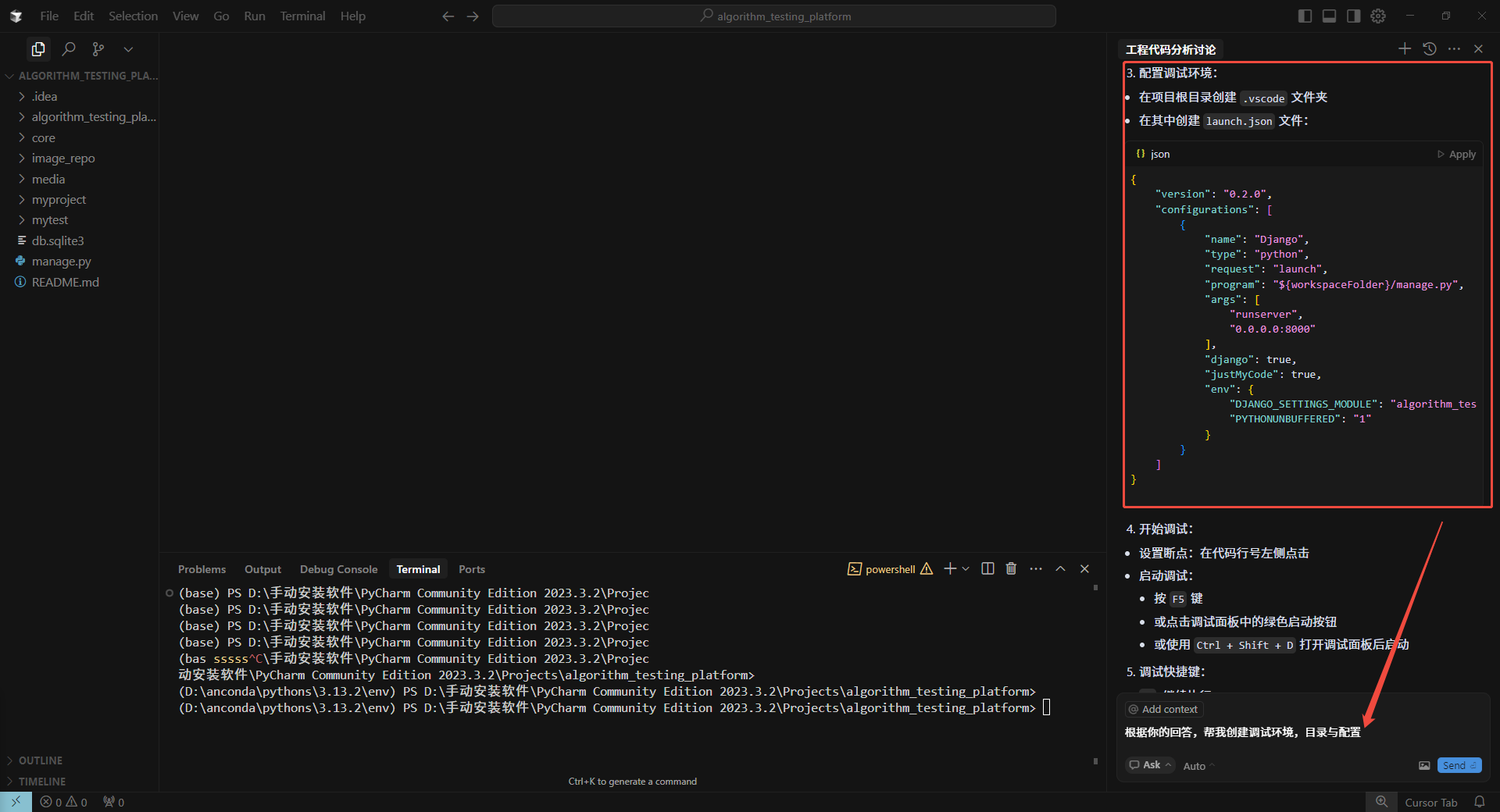 # 1、在项目根目录(/data/algorithm_testing_platform)创建或编辑.vscode/settings.json文件:mkdir -p .vscodetouch .vscode/settings.json# 2、在 settings.json 中添加以下配置{ "python.defaultInterpreterPath": "/data/pythons/3.13.2/env/bin/python", "python.analysis.extraPaths": ["/data/pythons/3.13.2/env/lib/python3.13/site-packages"], "python.languageServer": "Pylance"}# 3、重启 Cursor