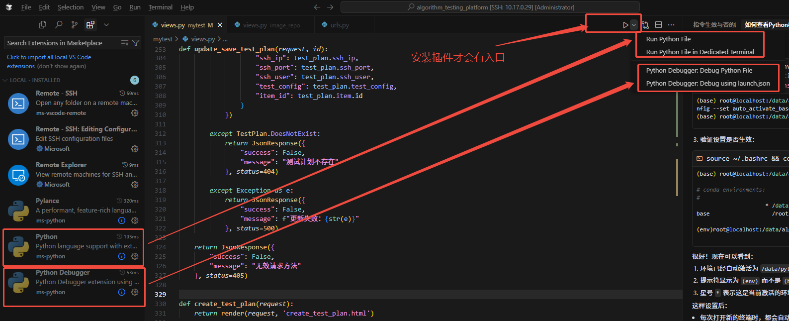 # 在远程环境中安装语言服务器和相关包conda activate /data/pythons/3.13.2/envconda install -c conda-forge python-lsp-serverconda install -c conda-forge jedipip install 'python-lsp-server[all]' pylsp-mypy python-lsp-black pylsp-rope