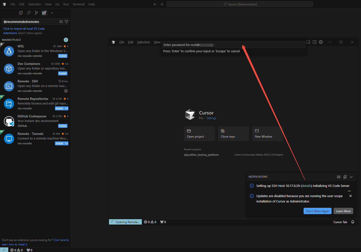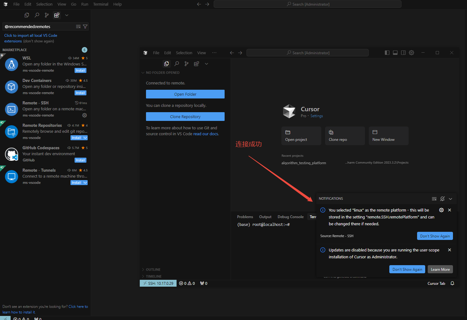 假设我的工程在Ubuntu上,我的cursor在win10上,现在,我想通过cursor在远程环境上开发。